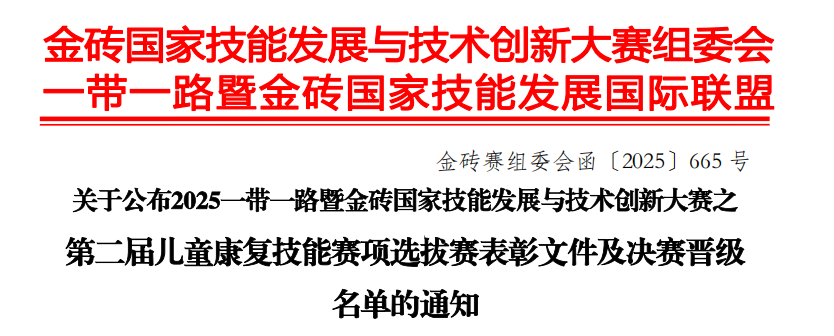 本次赛事由金砖国家技能发展与技术创新培训中心主办,中国发明协会、教育部中外人文交流中心联合主办。大赛聚焦特殊儿童康复核心需求,设言语康复、孤独症康复、感觉统合训练等四大赛道,以“理论考核+实操演示+案例答辩”模式检验参赛选手的康复实操能力和创新思维,对促进“一带一路”沿线国家特殊儿童康复经验交流、助力国家特教事业高质量发展意义重大。据悉,全国决赛将于2025年11月在宁波举行,公司晋级员工将与全国其他高校员工同场竞技,角逐最终奖项。