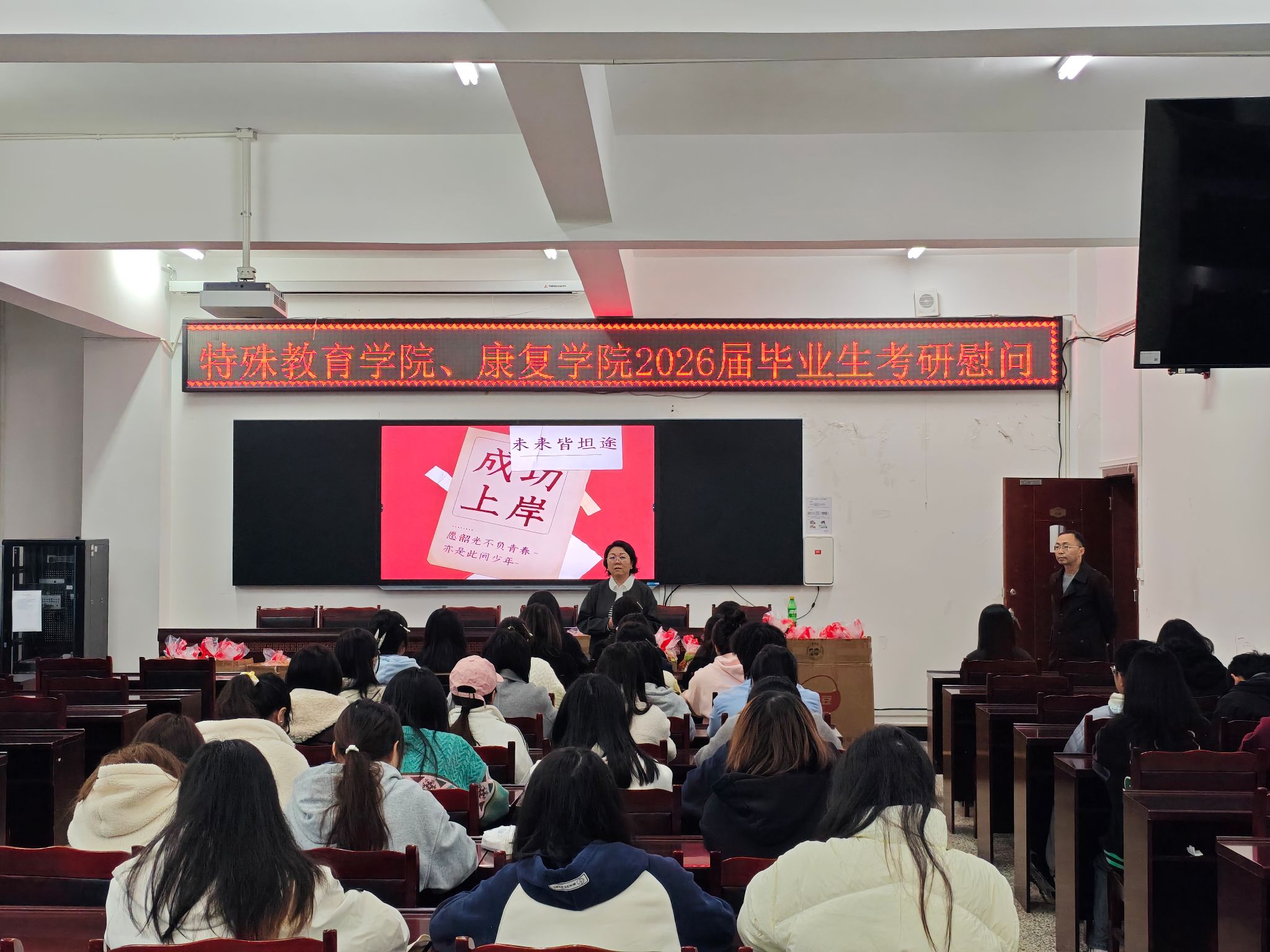 经理张梅首先代表学院向所有坚守梦想、奋力备考的同学们表达了高度的赞许和深切慰问。她指出,考研是一场锤炼意志、追求卓越的征程,在最后的冲刺阶段,要科学规划、劳逸结合、稳住心态,以最佳的状态迎接挑战,并祝愿大家都能成功上岸。随后党委书记谢延明表示学院始终是同学们最坚实的后盾,叮嘱同学们面对考试要有信心,遇到任何困难都及时向学院反馈。接着辅导员们把备考过程中如何克服困难的经验和方法分享给了同学们。最后,学院领导与辅导员们为考研学子送上了承载着学院对莘莘学子美好祝愿的“考研加油包”。