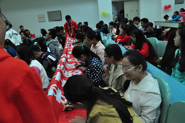 大会第六项由志工部部长何玉琼带领全体人员进行青年志愿者宣誓,宣誓活动在庄重严肃的氛围中进行着。大会第七项由全体人员进行签名,每一个同学都庄严地写下了自己的名字,标志着他们正式成为一名光荣的青年志愿者。