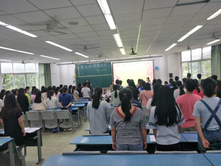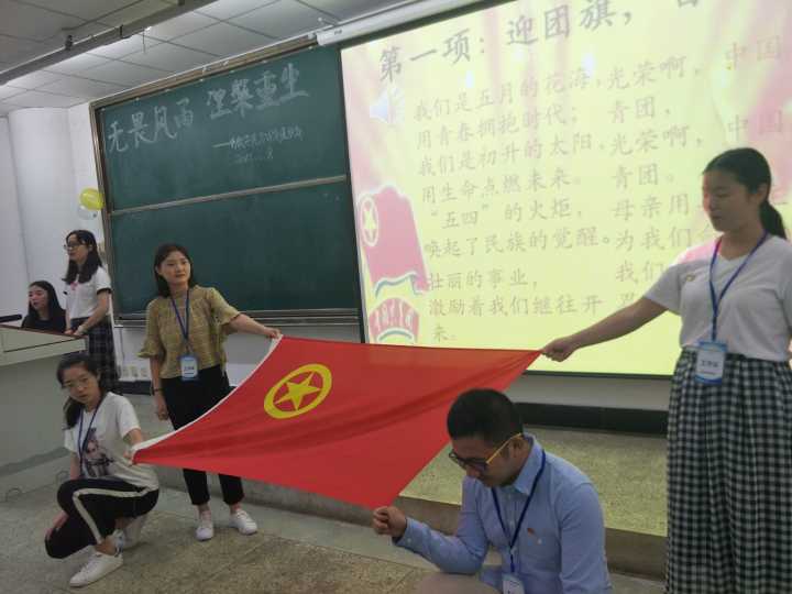 活动伊始,主持人上台致辞,欢迎各位团员代表的出席。接着,全体起立,迎团旗,奏唱团歌。礼毕后,主持人播放汶川大地震的救灾视频、纪念汶川大地震十周年的视频。观看视频后,随机采访了同学们对汶川大地震的感触。罗亚丽同学说:“汶川地震是永远的痛,当时山崩地裂、人民流离失所。但是十年后的汶川已经灾后重建,呈现一片祥和幸福之景,这是值得欣慰的。”