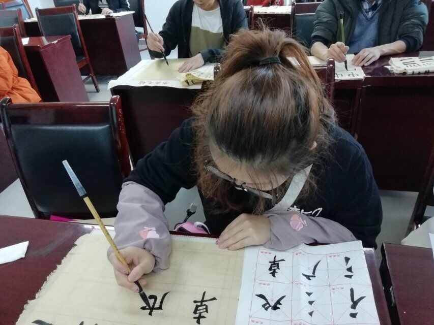 小老师首先指导员工握毛笔的基本姿势,员工们认真学习后,就开始练习基本的笔画。先从“横”和“竖”开始,小老师先在黑板上示范,同学们在掌握了运笔技巧后就开始积极的练习,从笔画到简单的汉字。在同学们练习的过程中,小老师们则对每个同学都进行了一对一的指导。