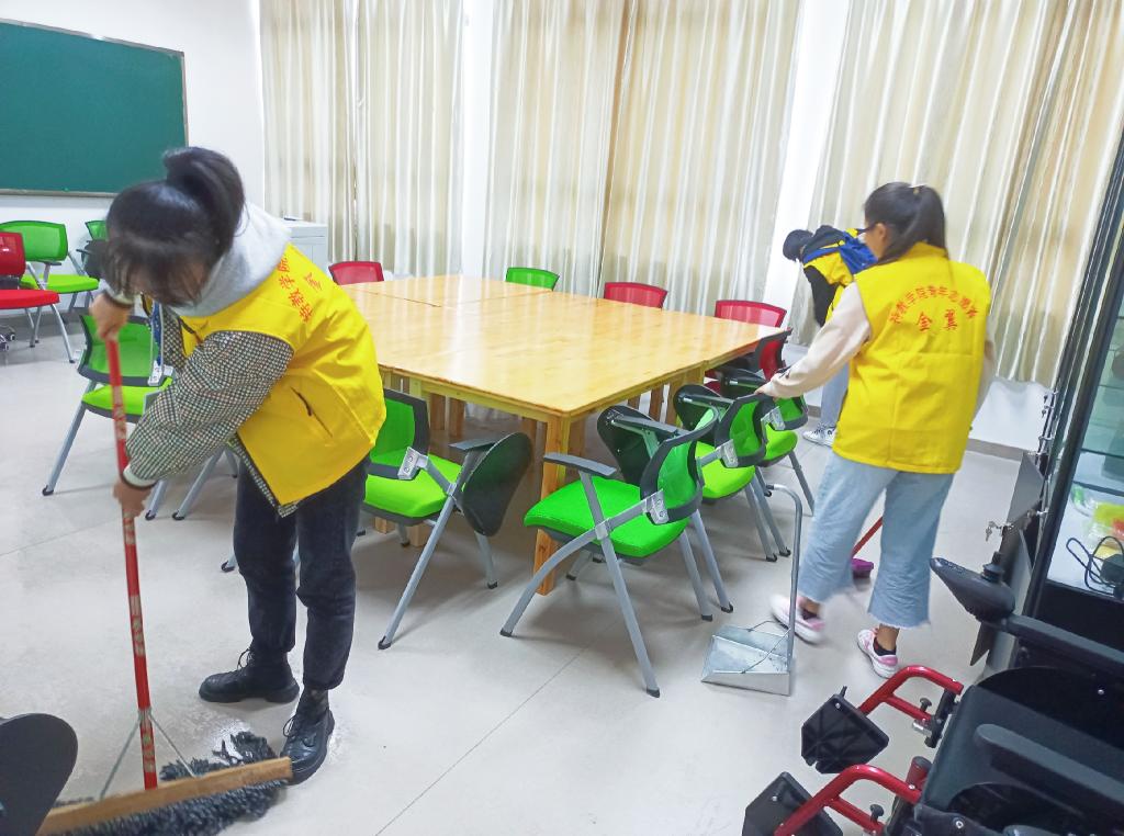 10月29日中午,所有人员在集合地点准备就绪,在各小组负责人带领下满怀干劲地开始本次志愿活动。本次服务范围为北校区操场、特教大楼A栋、D栋部分教室和行知楼部分教室。操场上,同学们弯腰捡拾;教室里,同学们踮脚擦拭。一间又一间教室,一片又一片空地,同学们大汗淋漓却行动不停。经过同学们的辛勤劳动,闲置教室变得窗明几净,公共区域也更加干净整洁。