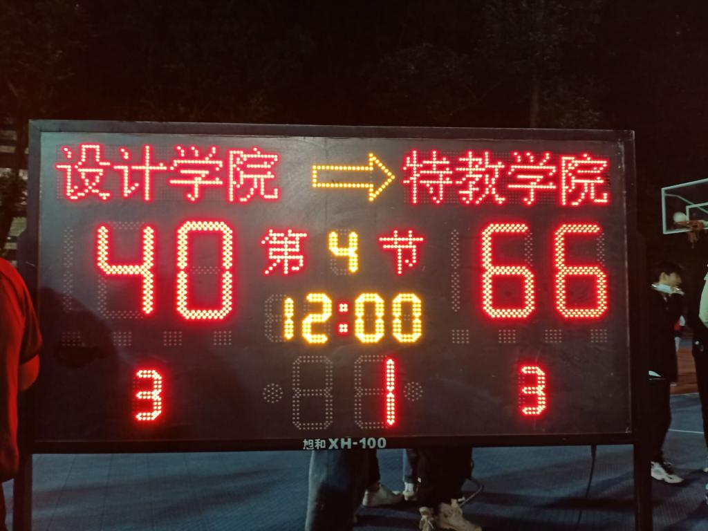 11月8日晚,公司篮球联赛再次开场。特教运动员们以坚定的信念走进南操场。比赛分为4节,第一节开始。在裁判的一声令下,大家开始抢夺篮球,但特教篮球队员以迅雷之速夺得了篮球。13号韩鸿昊一个帅气的一分球,首球进框。欢呼声接连不断。紧接着30号眭强两个一分球进框,赛场上的对战进入白热化阶段,观众们为激烈的战况欢呼喝彩。第一节比赛比分为5:20,特教学院暂时领先。第二节比赛开始,5号邓竹均远投三分轰动了全场,队员们打着手势,比划着战略,从容不迫地应对设计学院的“进攻”。第二节比赛以22:37闭幕。音乐声随即响起,啦啦队员活力满满的进行舞蹈表演,为运动员们加油鼓气。第三节比赛由女子篮球队进行对抗,7号刘丹首球突击一分球,紧随其后的是32号陈微投篮成功。场上的掌声热烈持久,最终以23:47暂时领先。最后一节决赛开始,15号罗浩然二分球得分,5号邓均竹再次远投三分球激起大家的欢呼,比赛进入关键时刻。在最后五分钟的时间里,设计学院激烈的角逐也没能超过特教学院,比分定格在40:66,特教学院取得本次比赛的胜利。