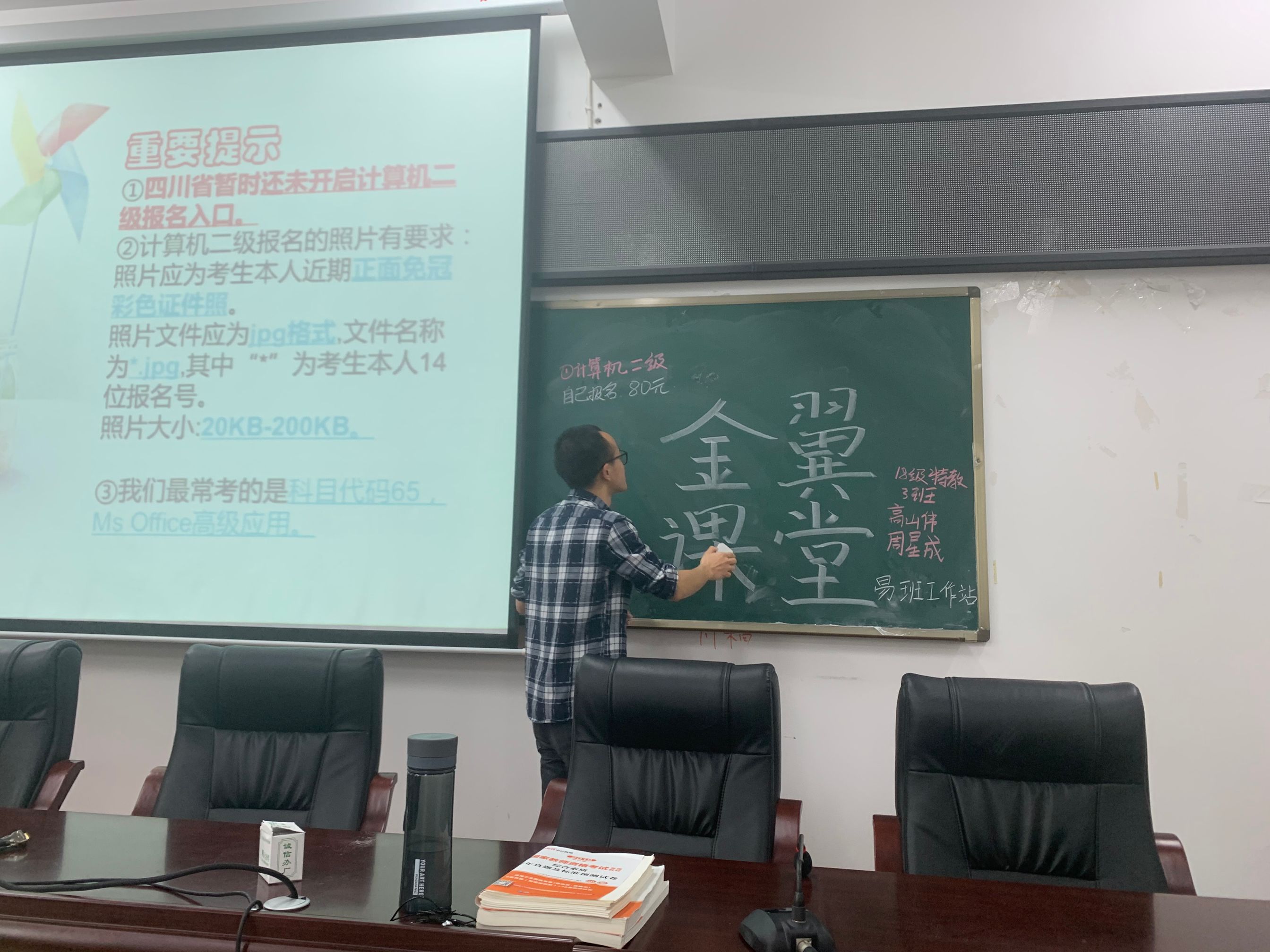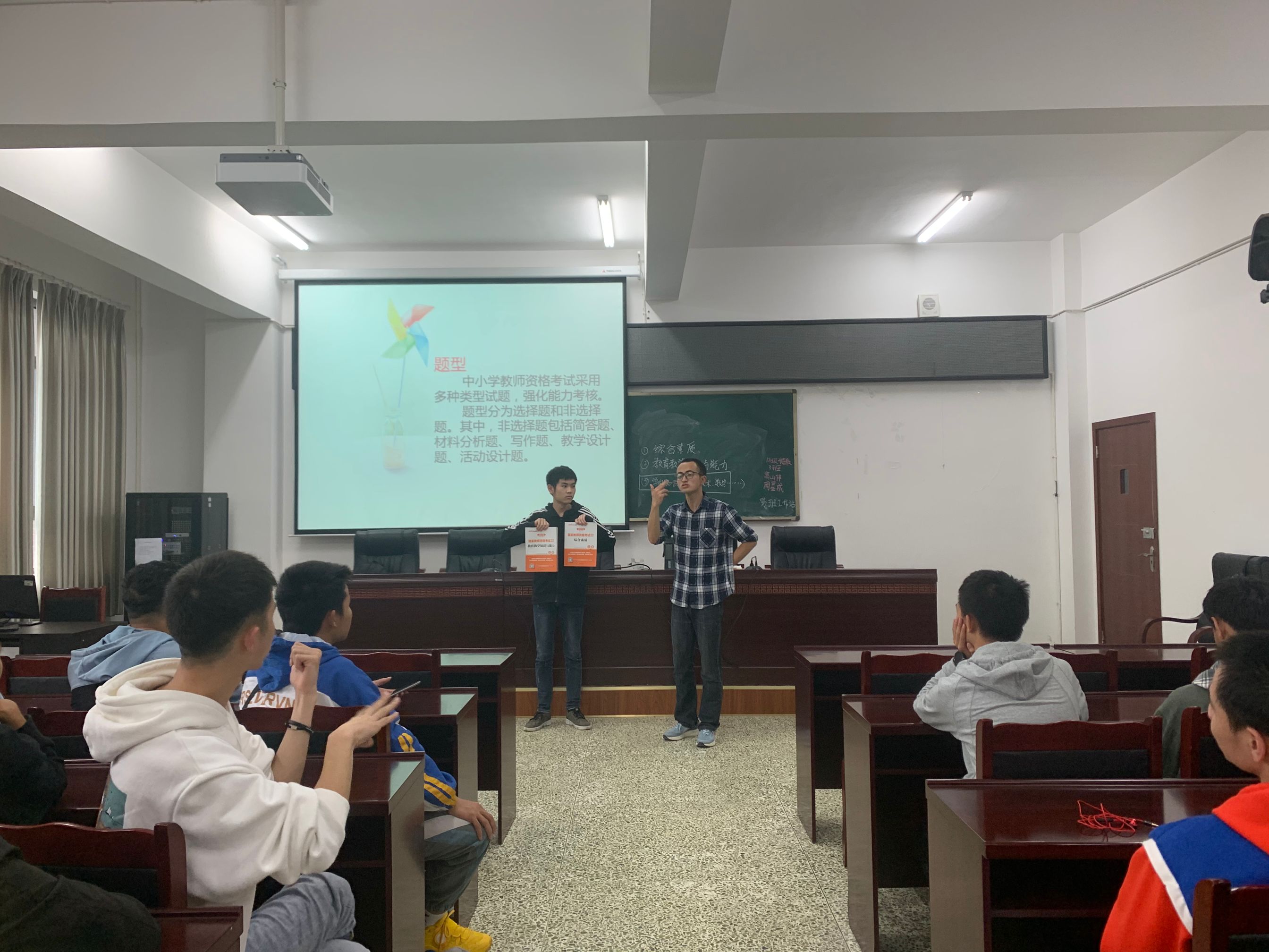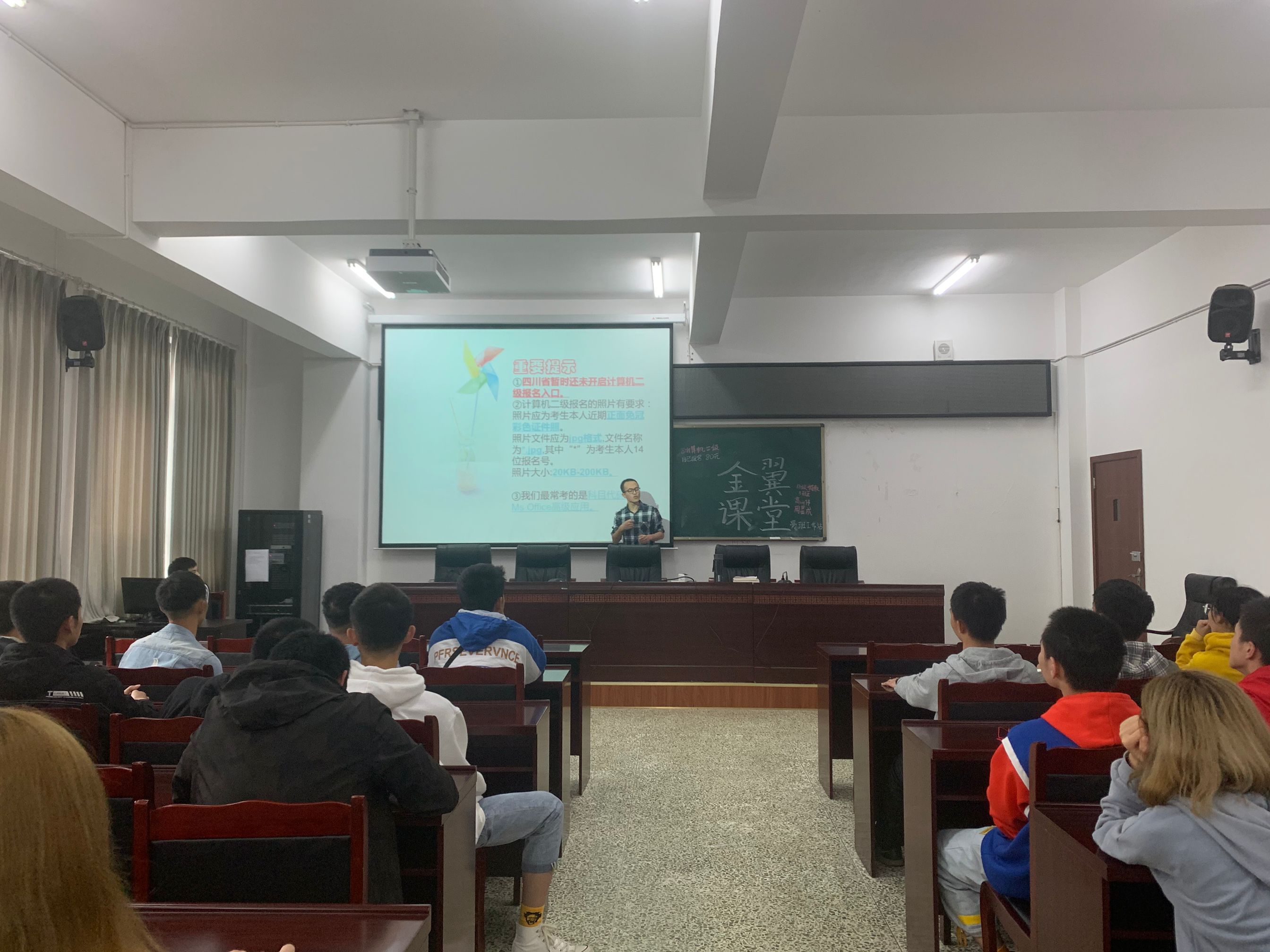 首先高山伟同学以自身计算机二级考试和备考教团队格证的经历为例,向大家讲明了老员工努力提升自身素质的重要性,他从考试的性质、方式再到考试的题型和报名方式等方面为家分享了计算机二级和教团队格证考试的报考注意事项。他还用PPT展示一些考试真题,让同学们对教团队格证考试的方式有了更进一步的了解。期间,同学们对不懂的地方积极提问,他一一为大家解答。他还强调,计算机二级是技能型的证书,就和驾驶证一样,不是说你有驾照就一定要当司机,也更不是说你考上了计算机二级就一定要去从事计算机二级的工作。之后,他建议大家平常学习要劳逸结合,合理安排自己的时间,不要有过重的心理负担,让自己的生活有节奏感。最后,高山伟为大家展示了一段趣味视频,在活跃课堂氛围的同时,也向大家分享了一些视频拍摄、剪辑的技巧。