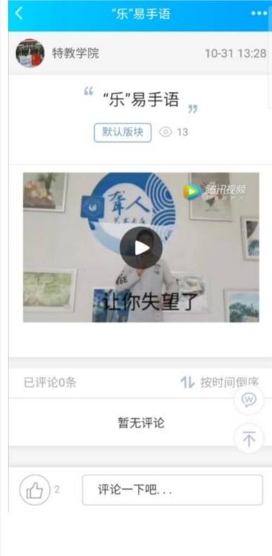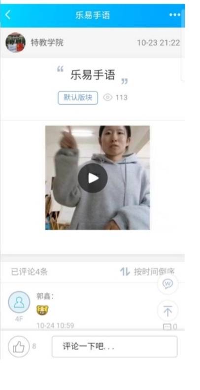 本网讯(文、图/吴冰冰)十月,公司易班分站举办易班“乐易手语”特色活动,邀请公司20级艺术设计二班的李蒙蒙和朱孟辉同学录制视频,并在公司易班上进行推送。
