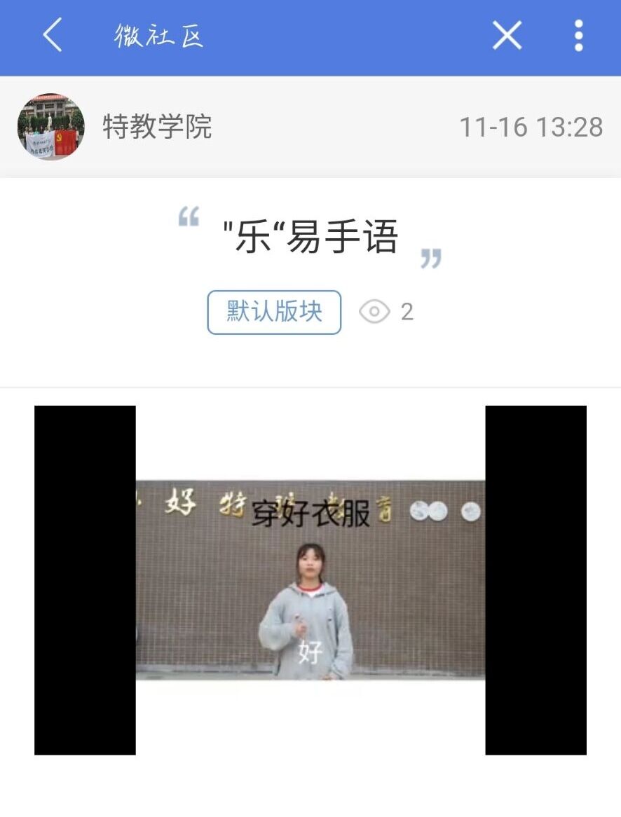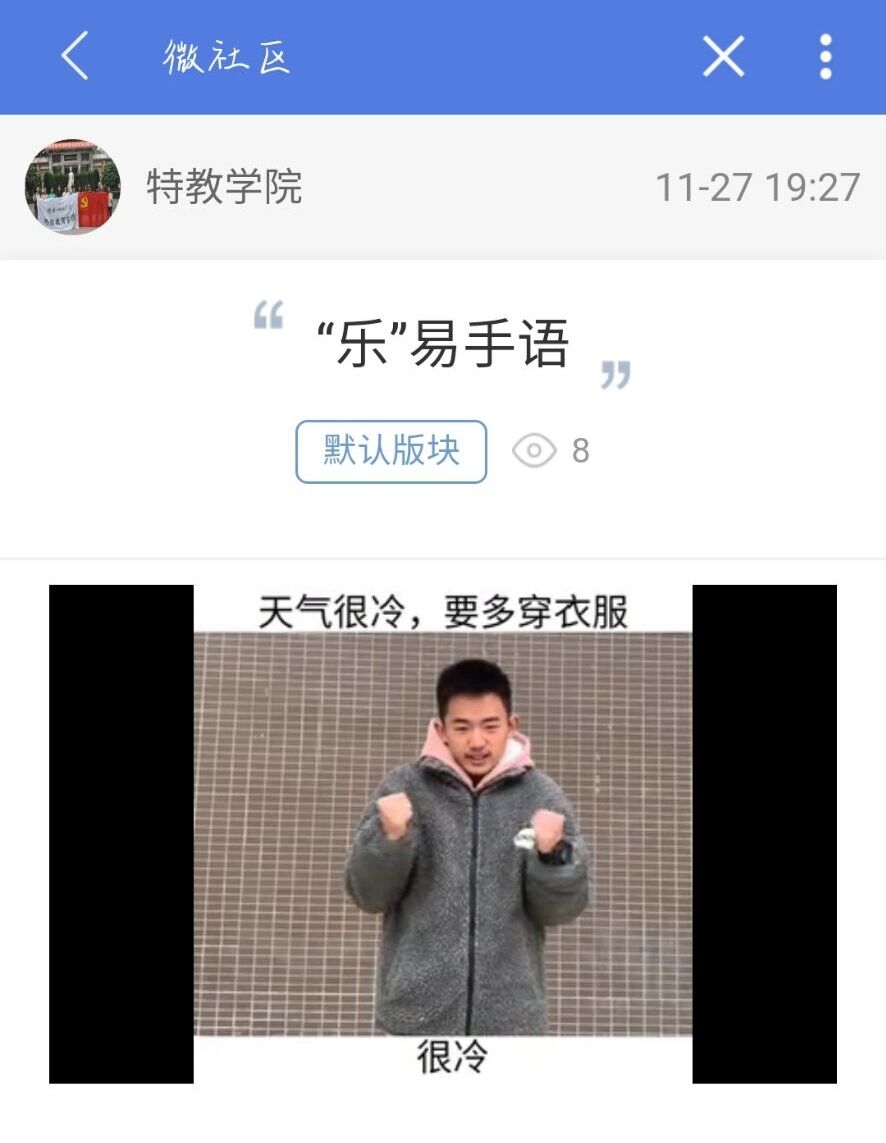 本网讯(文、图/饶雪钰)公司易班分站于十一月份举办了分站特色活动——“乐易手语”, 以拍摄手语视频推送到易班平台的方式,推广一些日常手语。本次活动邀请了2020级特教三班杨彬焱和王露洁进行手语视频拍摄,并通过易班推送。
