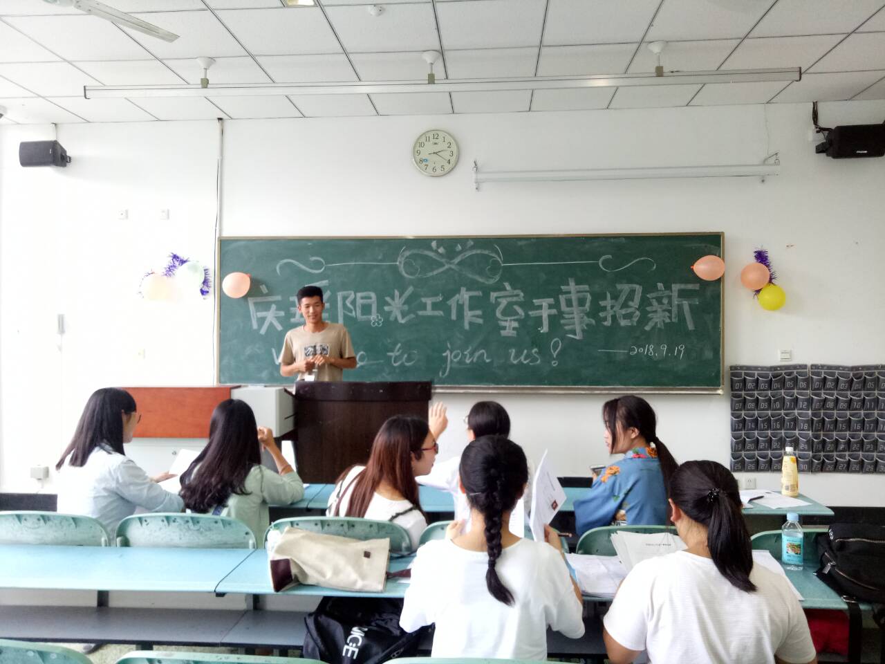 为了传扬志愿服务精神和为新生提供一个广大的志愿服务平台,91912点,庆瑶阳光工作室干事招新工作在行知楼121教室成功举行。