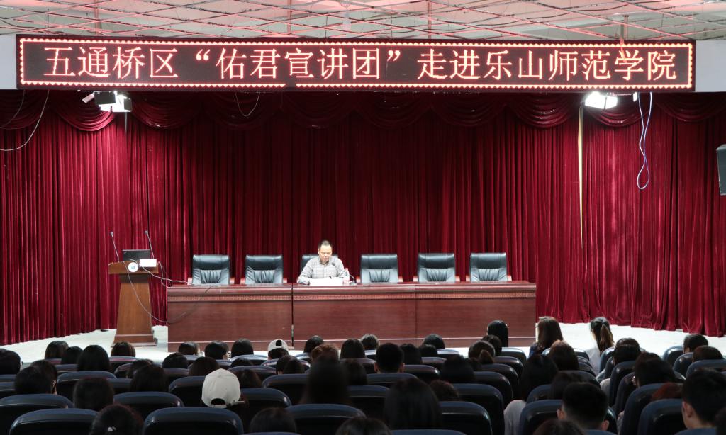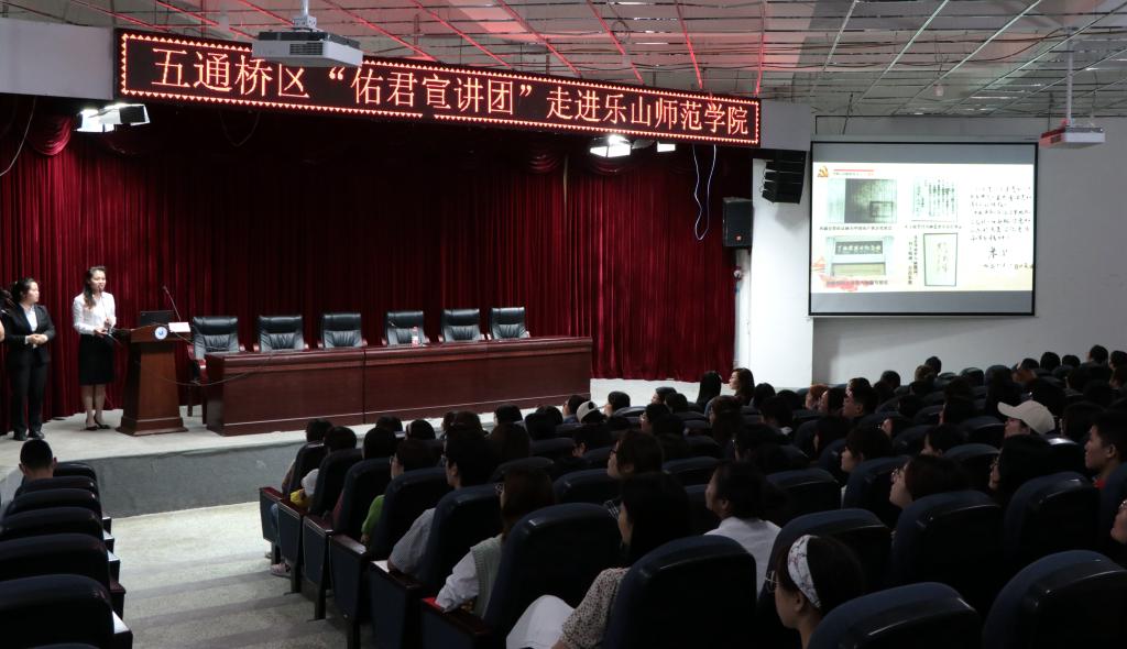 本网讯(文、图/杨文玉)4月27日晚,乐山市五通桥区“佑君宣讲团”走进特教学院,为师生带来了一场精彩的地方党史故事宣讲会。中共乐山市五通桥区委宣传部副部长、区委外宣办(政府新闻办)主任张萍、特教学院经理张梅、党总支副书记兰芳,学院全体辅导员、员工党员、入党积极分子以及2018级全体员工聆听了宣讲。主持党务工作的党总支副书记刘宗泉主持了宣讲会。