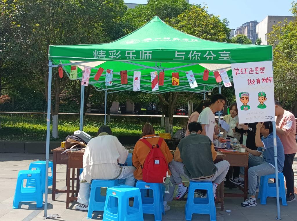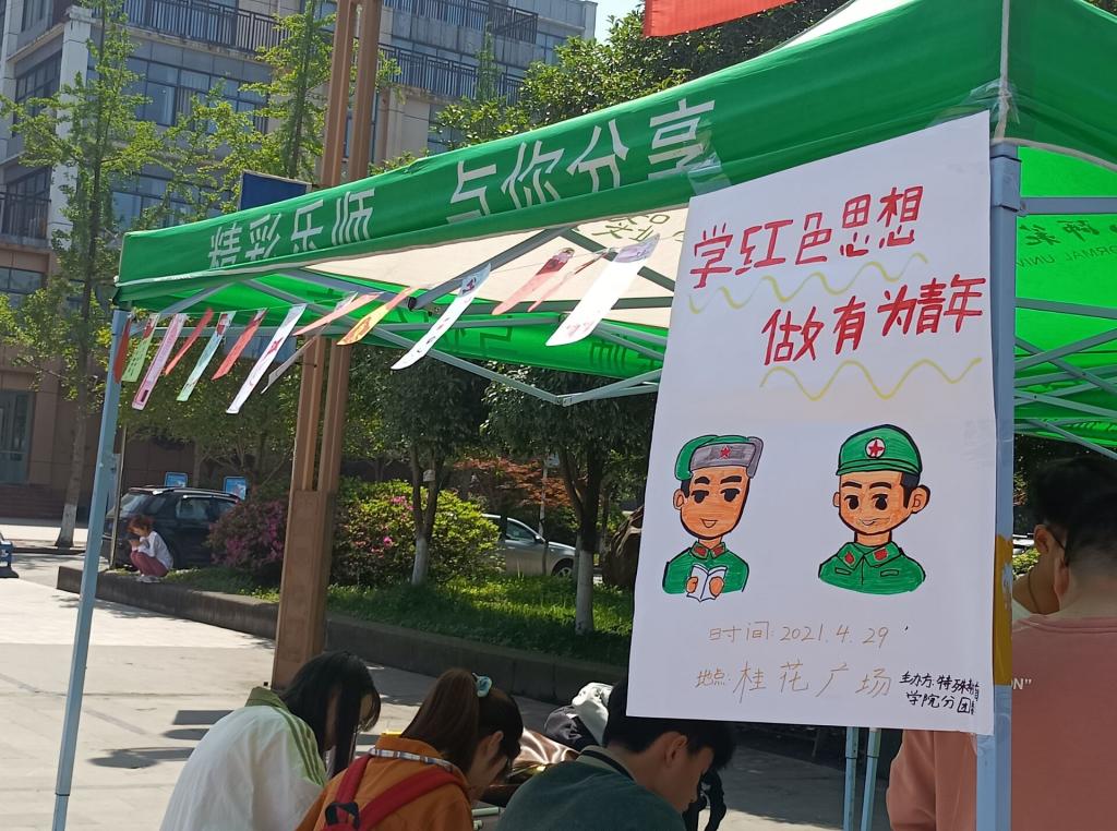 本网讯(文、图/陈瑜)4月29日下午,特教学院在桂花广场开展了思政超市系列活动之“绘红色故事,品时代精神”主题活动,以绘画红色故事书签、纪念“五四”运动感言、各学院员工知识竞答互动等形式来交流党史学习感悟。