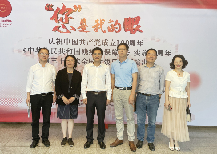 5月14日下午,学校副董事长李朝晖、法规处处长罗明礼、科研部部长李银斌以及特教学院经理(执行)张梅、党总支副书记(主持党务工作)刘宗泉等应邀观看了“您是我的眼”首场演出。演出前,李朝晖、张梅、刘宗泉等与出席首演现场的省残联理事长杨志远,副理事长马骏、黄维德等进行了沟通交流。16:00,演出正式开始,精彩纷呈的演出,让大家为导演的精心安排、演员的全力演绎而感动,为公司手语舞蹈节目《永远跟党走》掀起的演出一波又一波的高潮而喝彩,更为四川省残疾人事业的蓬勃发展而欣慰。