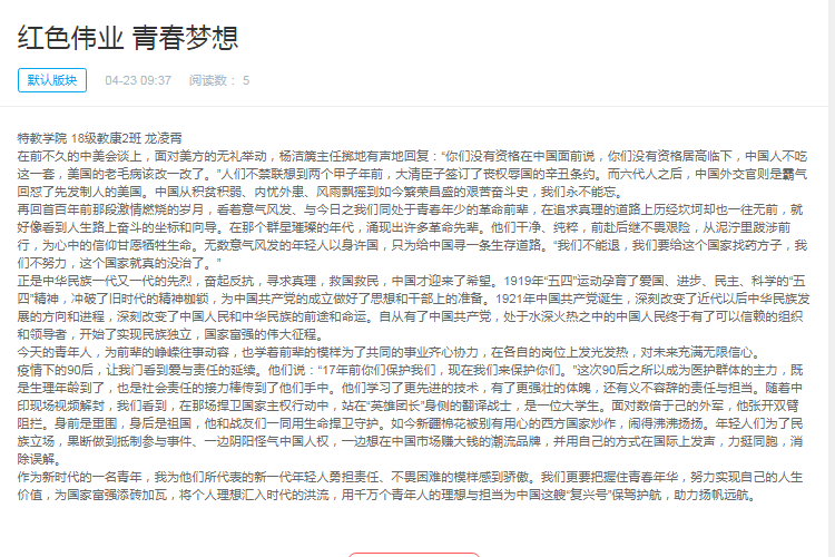 同学们积极参加本次征文比赛,上交了二十多份优秀作品,并发布到易班平台相互交流学习。经过学院评委组的评选,八名同学获得了“优秀征文作品奖”。同学们在文章中回顾建党百年征程,抒发爱党爱国情感,如2019级特教一班饶雪钰通过倾听优秀老党员讲述革命故事,发出“作为华夏儿女,都应当将党的历史和初心铭记于心。以史为镜,开创更美好的明天”。2019级特教二班陶易琳则以“我是一棵扎根于蜀地的树”为视角,见证了人民的生活如何一步步变好,见证了从改革春风吹满地到脱贫攻坚全面建成小康社会的实现,见证了在共产党的带领下创造的一个个奇迹。