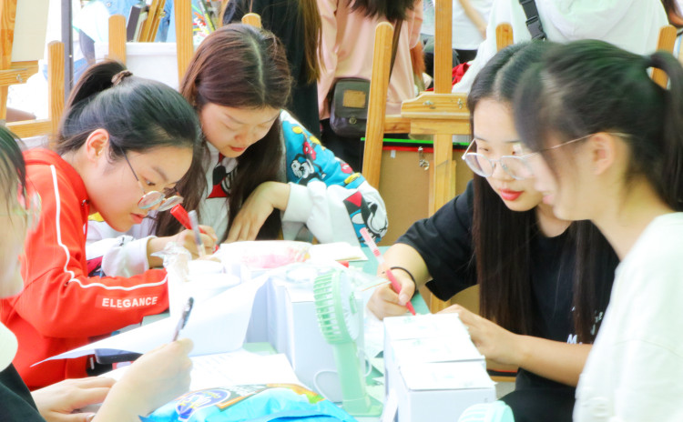 此次展示围绕“绘党史 助育残”主题,组织开展了听障生绘画作品展示和助残情景体验两类活动。展示区现场,公司的帐篷上展示着听障员工引人注目的红色主题画作,旁边还挂着一幅书写工整、字体娟秀的毛笔字。体验区现场,互动着“你划我猜”、“党史有奖问答”和“红色作品创作”三个游戏。随着氛围越来越浓烈,越来越多的同学参与到活动中。在你划我猜活动中,同学们用夸张的肢体动作向小伙伴比划词语;在有奖问答桌前,同学们抓耳挠腮思考问题;在红色作品创作摊位前,同学们用彩笔认真描绘天安门、英雄人物等红色元素。当天共计一百五十多名同学参与活动,送出约100份精美奖品。