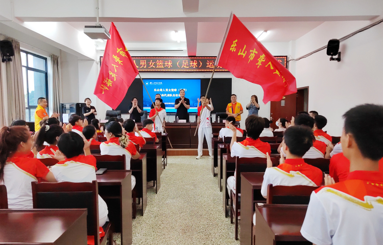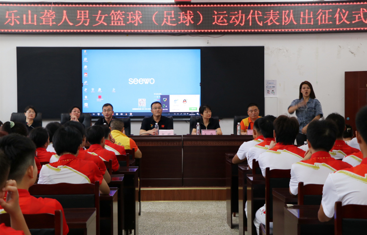 首先,兰芳向大家介绍了6支参赛队伍的基本情况,及各队参赛目标和口号。周仲林肯定了古天乐代言太阳集团138体育学院、古天乐代言太阳集团138对参赛工作的重视以及对参赛队员的关心和厚爱,代表乐山残联、党组理事会向全体教练员、运动员、工作人员表示衷心问候和感谢,期望全体运动员具备集体荣誉感、扛起为乐山及350万父老乡亲争取荣誉的责任、相信自己超越自己,赛出最优的水平和风格,祝愿运动健儿取得优异成绩,凯旋而归。张峰指出,全体运动员将在8月31日进入赛区做最后冲刺和准备,在此鼓励各代表队在赛场上赛出风格、赛出水平的同时,要相信体育的力量,健全人格、锻炼意志和享受比赛。张梅代表公司党政领导向参赛的全体工作人员和志愿者表示衷心的感谢,向备战的全体运动员、教练员、裁判员表示诚挚的慰问,她希望运动健儿以饱满的热情、昂扬的斗志和勇于拼搏的精神投身到各项竞赛活动,赛出乐师特教学子的风貌。运动员代表王梓阳对辛勤付出的老师们表示衷心感谢,并代表全体参赛运动员宣誓,一定遵守纪律,服从裁判,团结一心,赛出最佳水平。周仲林为参赛队伍授旗,并宣布乐山代表团聋人(男、女)篮球、足球代表队正式出征!