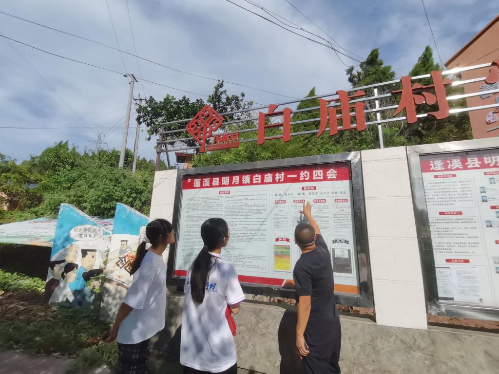 白庙村坐落于遂宁市蓬溪县西部、明月镇北部,2017年实现人口全面脱贫。白庙村村委会因拥有独特的基层治理模式,曾被评为“遂宁市基层治理先进党组织”,在治理上始终贯彻“幸福共享、文明共育、产业共耕、组织共建、生活共居、社会共治”六大理念。实践团队通过与白庙村李庭书记的交谈,了解到白庙村在2021年成功争取到乡村振兴示范培育村建设,村集体经济年均增收5万元,实现集体与农户“双增收”,使群众的幸福感、获得感更加强烈。