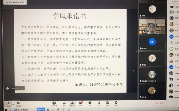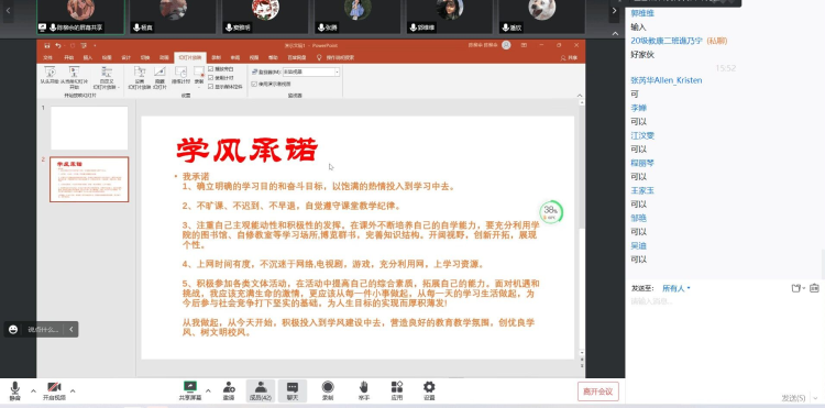在各班学习委员的带领下,同学们面对镜头庄严承诺,严格遵守网络课堂秩序,以饱满的热情投入到学习中去,形成了全体员工遵守学校规章制度的浓厚氛围,激发了员工努力学习的进取意识以及集体主义感,增强了班级凝聚力。同学们纷纷表示已明确了新学期的学习任务,并将有计划、有步骤、有效率地完成奋斗目标。