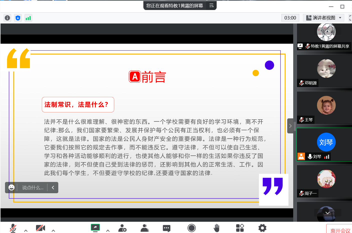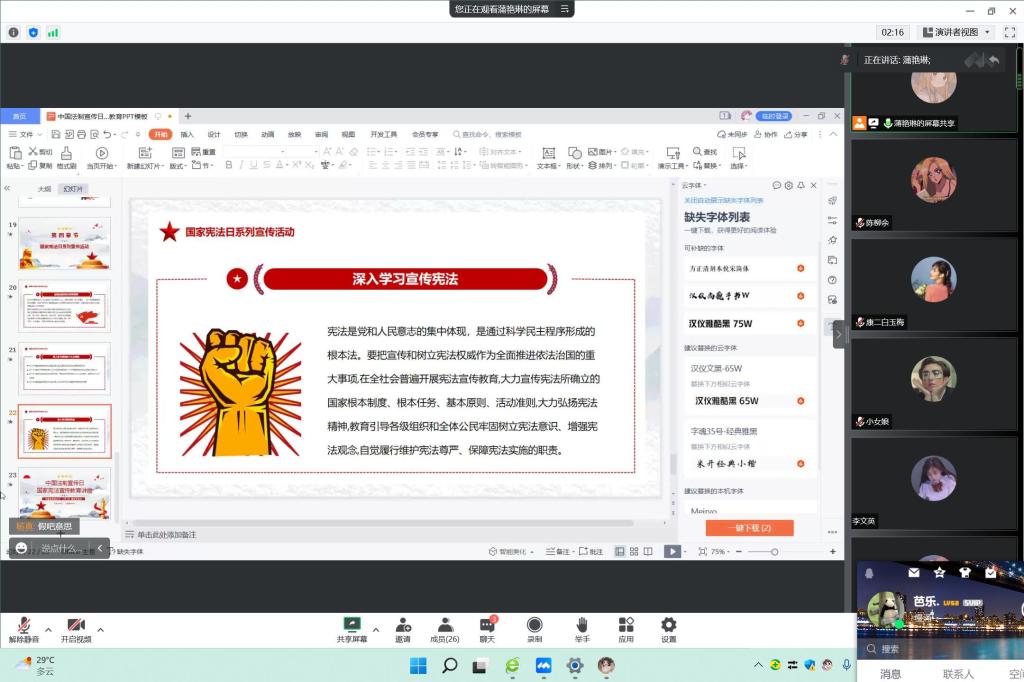 本次活动为线上学习,由各班学习委员带领大家登录中国普法网学习相关法治教育资源。同学们采用“学习-练习-测评”的学习模式,学习坚持中国特色社会主义法治道路、我国的现行宪法、电信网络诈骗、劳动合同的订立与解除等主题内容。