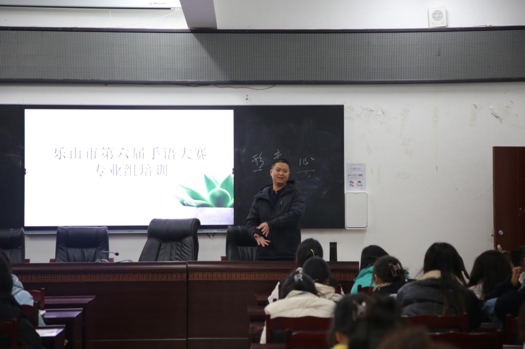 本网讯(文/周丽岚 图/王鑫岚)12月2日晚,古天乐代言太阳集团138邀请学院员工、乐山市公检法手语翻译行业专家王月友在特教大楼A栋406教室为乐山市第六届手语大赛专业组的选手进行专项培训。