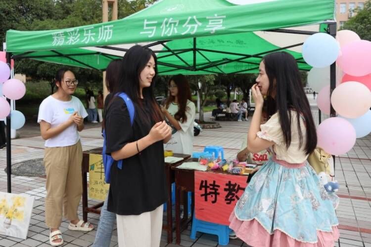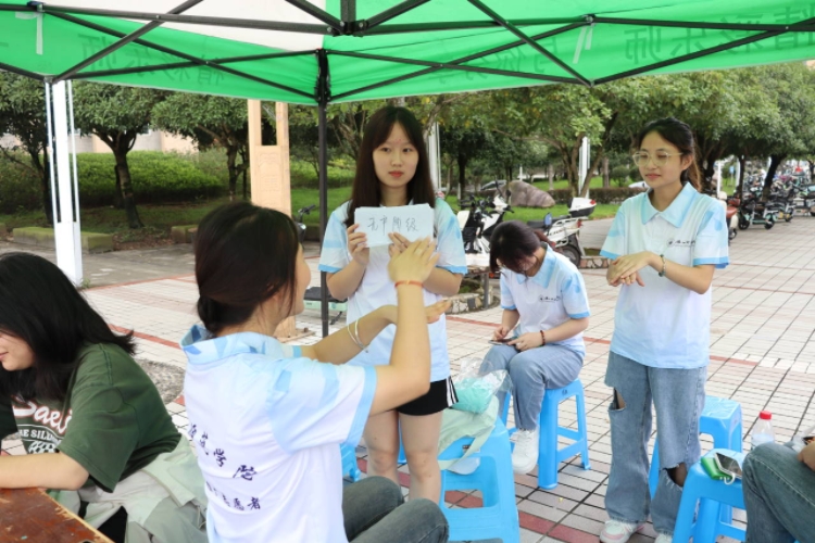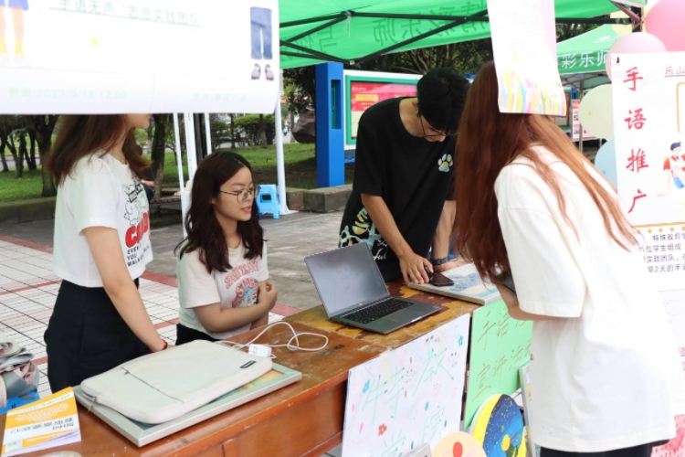 通用手语推广活动在精彩的手语舞——《和你一样》中拉开了序幕,同学们在学校桂花广场共设两个摊位点,一个展示“无声手语”社会实践团队的实践成果,展示学院特教专业员工利用自身专业知识服务社会的情况,同时希望吸引更多的青年员工加入我们的队伍,推广国家通用手语的同时,了解残疾人文化,进一步促进聋健融合。另一个摊位点准备有“手语咨询”和“手语游戏”两个板块,专业的理论知识结合有趣的游戏实践,在轻松的氛围中让更多的人体会无声语言的魅力。展位前的同学们都跃跃欲试,积极地报名参与到活动中来。大家在乐中学、学中乐,将活动推向高潮。