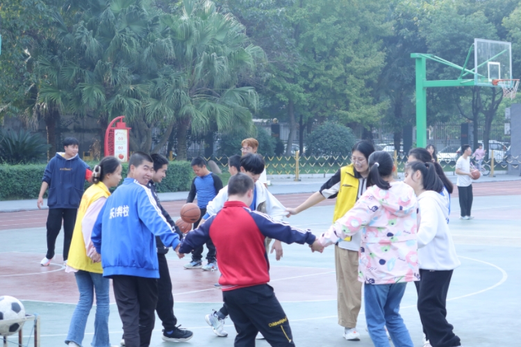 志愿者们在乐山特殊教育学校门口集合,随后在操场与培智部73名孩子见面。志愿者们与特校老师进行交流,充分了解孩子们的个人情况,以便更好的融入他们。随着欢快的音乐响起,活动开始了。孩子们在体院带教老师的动作示范下,跳起了充满激情的热身舞蹈。热身结束之后,志愿者根据具体情况,将孩子们分为低段、中段和特奥运动三个组别,每个组的孩子们都非常积极地参与到活动中,听从主教老师的指令。当孩子们遇到困难时,志愿者们及时提供帮助,让孩子们更加轻松愉快地进行运动和游戏。在志愿者的引导和照顾下,孩子们度过了一个充满活力和欢笑的下午。在活动的尾声,志愿者与孩子们一起坐在操场上,孩子们从腼腆害羞,到逐渐敞开心扉拉进彼此间的距离。许多孩子们积极地举手想要展现自己准备的节目,操场上回荡着孩子们的欢笑声和志愿者们的热烈掌声。