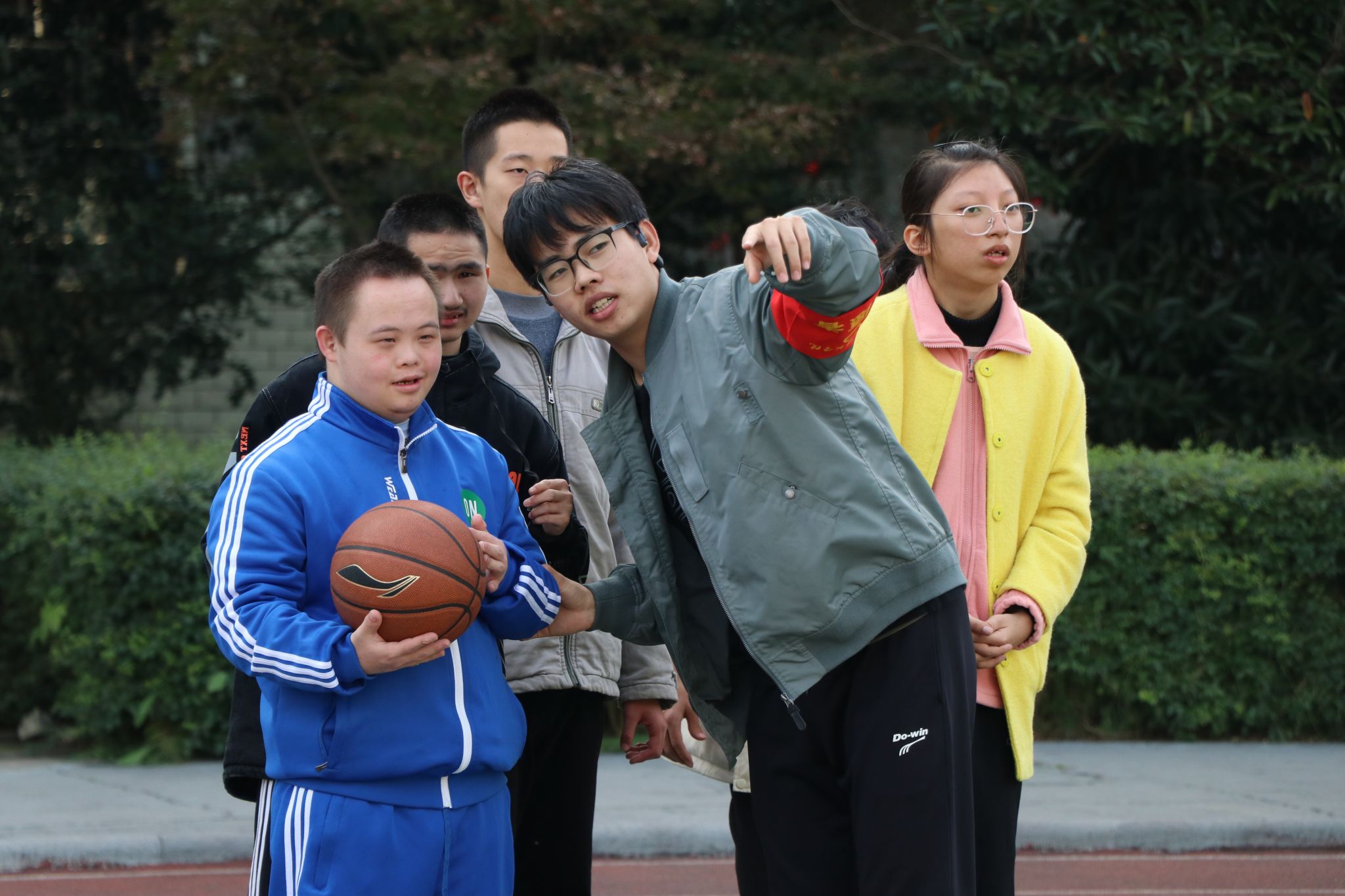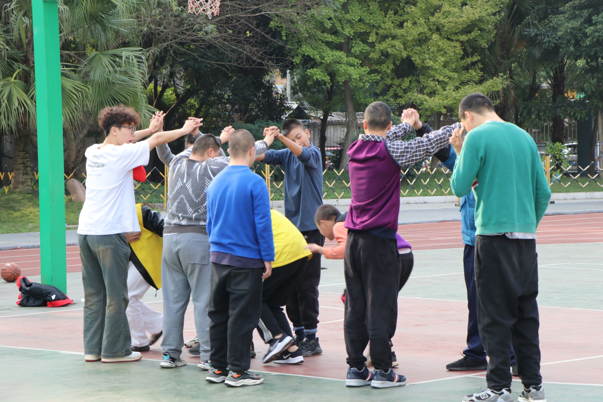 首先在志愿者的带领下,特校的孩子们扭动着身体,转动着小脑袋,积极配合并完成相应的热身运动。之后,参与活动的孩子们分为低中段和高段两个年龄段分别进行活动。低中段的同学们开展简单的小游戏,比如萝卜蹲、老鹰捉小鸡、丢手绢等活动,目的在于训练其粗大动作,加强孩子动作的协调性。高段的孩子们继续以特奥项目训练为主的康复活动,他们在体育学院志愿者的带领下,进行投篮、原地拍球、来回运球等训练。在篮球场上他们挥酒的汗水,充分展现出他们对体育运动的热情和积极性。