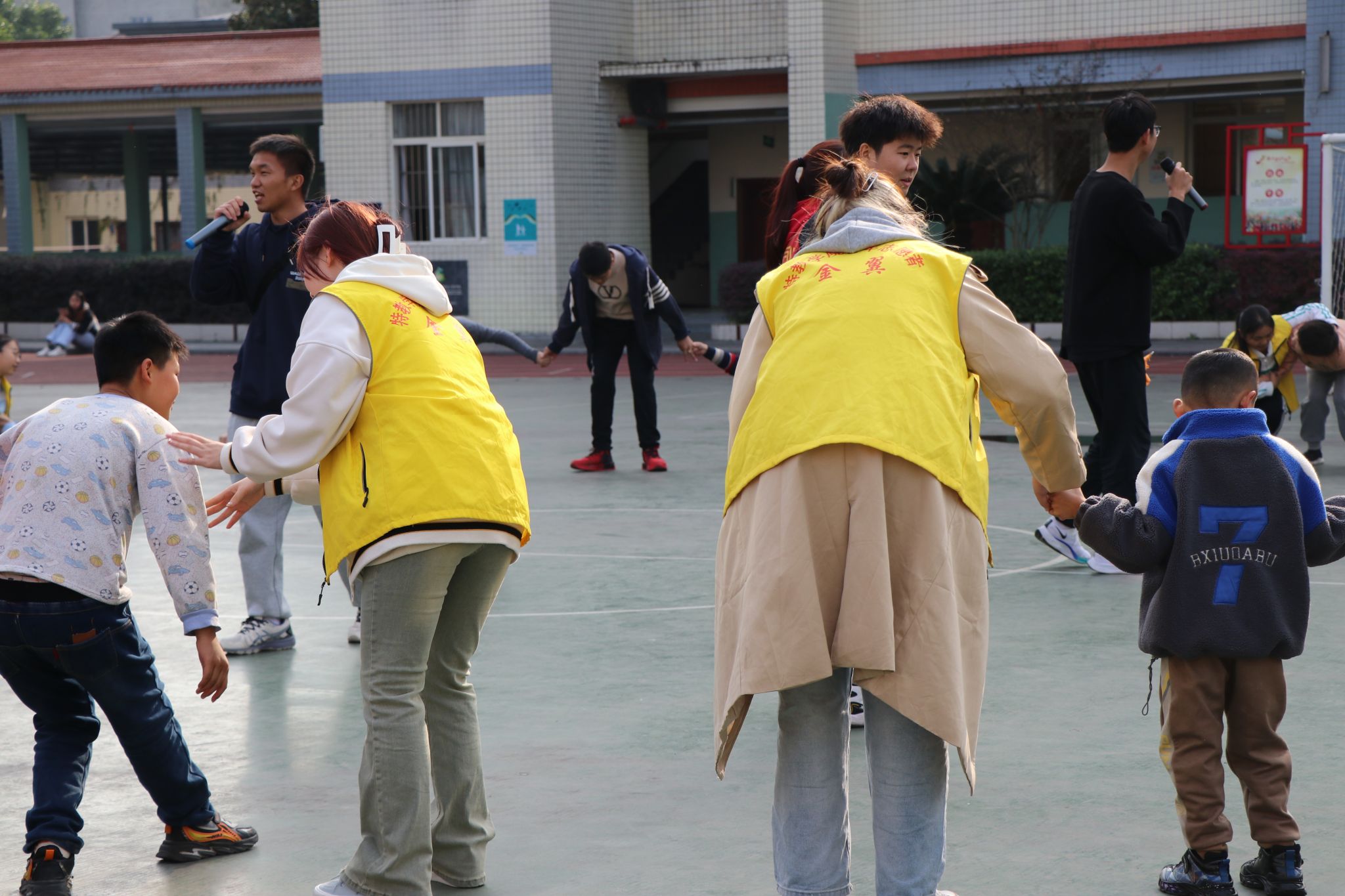在休息时间,有的年级组织唱歌,有的年级玩起了各种小游戏,以至操场上志愿者和孩子们的歌声、欢笑声此起彼伏。每个人脸上都洋溢着灿烂的笑容,每个人都把自己融入到集体之中,感受到了秋日的暖意。所有活动结束之后,志愿者清点活动的人数,并将孩子们送到了教室里。但孩子们都意犹未尽,依依不舍,期待着下一次的见面。