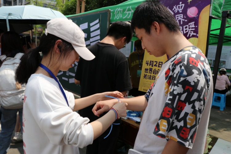 活动以“全生涯服务,全方位关爱”为口号,旨在呼吁社会各界共同关注孤独症儿童,为他们提供全方位的支持与关爱。场地周围挂满了有关孤独症的海报,向公众普及孤独症的相关知识。桌子旁则展示了一幅幅由“星星的孩子”创作的画作,这些画作充满童真与想象力,让人感受到了孤独症儿童内心的美好世界。为了让同学们更好地了解孤独症,工作人员精心准备了“撕标签”和“答问题”两个互动游戏。参与游戏的同学们不仅有机会赢取精美的奖品,还能在轻松愉快的氛围中学习到更多关于孤独症的知识。