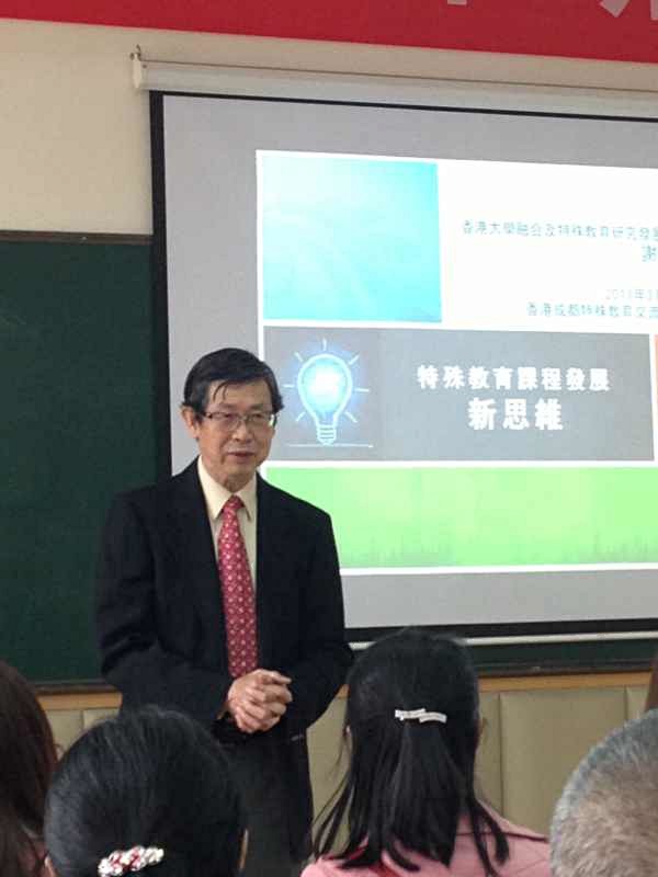 本次研讨会主要由学术讲座和座谈会两部分构成。在上午的学术讲座中,谢宗羲院士围绕《特殊教育课程发展新思维》主题,对香港特殊学校课程发展历程与特色、影响课程发展的因素、对课程发展的反思以及如何建构特殊教育课程等进行了讲解,对他们团队的研究成果——《融通课程》的基本结构、实施与评估进行了重点介绍。在下午的学术交流座流会上,黄万彬院士与谢宗羲研究院士分享了《语言发展及协助智障儿童语言发展的原则》,就语言发展的基本要素、智障儿童语言发展困难的原因以及训练的原则,与参会教师进行了深度交流。
