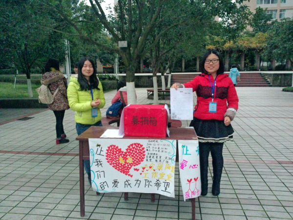 吕飞家庭是农村低保户,哥哥刚刚大学毕业。2012年,吕飞的母亲患了子宫癌,为给母亲治病,家里已欠下十多万元的债;2014年,在准备给母亲做手术的时候,哥哥又被检查出胸膜炎、心脏病。然而,在他们都以为一切不好的都结束了的时候,母亲却在2014年12月6日中午不幸被小轿车撞出3米,脑部严重受伤,至今昏迷不醒。现在手术费,医药费都没有来源。学院在了解这些情况后,迅速组织庆瑶阳光工作室的员工干部开展爱心募捐活动。此次募捐以“献出一份爱,拯救一个家”为主题,呼吁全校员工奉献爱心,帮助吕飞的家庭。工作室分别在桂花广场、百果苑、武珈山食堂等地设点募捐,募捐过程中,虽然寒风肆虐,但所有工作人员都积极地投入到工作中。令人欣慰的是,同学们纷纷响应,捐出5元、10元、20元不等,以实际行动来表达对吕飞同学的帮助与支持!