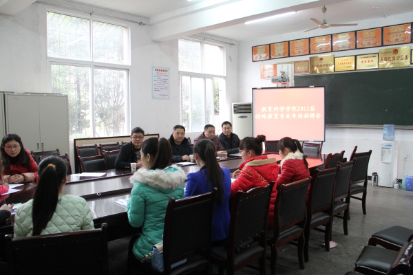1月8日下午,宜宾市特殊教育学校在教科学院会议室举办了特殊教育专业专场招聘会。宜宾市特殊教育学校副董事长李志强一行5人、教科公司党总支副书记何永红出席了专场招聘会,教科学院特殊教育专业2011级本科员工参加了招聘会。