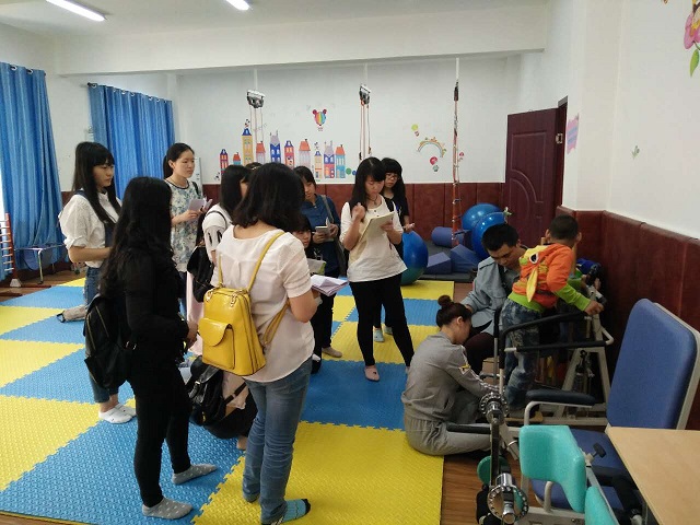 首先,朱德川介绍了乐山市夹江县人民医院康复科第二治疗区的基本情况。夹江县人民医院儿童康复病区(第二治疗区)位于夹江县残疾人综合服务中心,是夹江县残联与夹江县人民医院合作共建,集临床诊断,功能评估,康复治疗,辅具加工于一体的新型的残疾人康复中心。接着,钟挥将同学们分成三个组,进入不同的康复室,由专业康复治疗师带领观摩脑瘫儿童的现场康复,并给员工讲解脑瘫儿童的临床表现,动作评估方法,康复训练计划的制定等相关内容。同时,他还带领员工亲身体验不同的康复器械。员工们认真记笔记,积极思考并与康复治疗师交流。