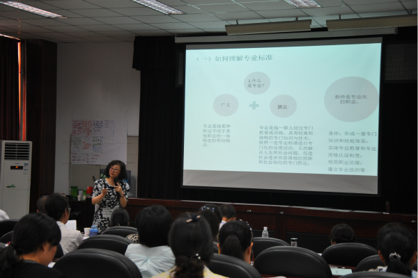 在讲座中,汪红烨从四个方面为培训学员们介绍了特教教师的专业标准。她首先从《特教教育教师专业标准》的颁布背景出发,重点讲解了《特殊教育提升计划(2014—2016年)》的主要精神,她认为教师专业化的水平将直接影响着特教教育的质量。接着从实证研究出发,对比介绍了湖南、四川、河南等省特教教师专业素质的现状,指出需要进一步提高特教教师的专业化水平并且在更多的高等学校增设特教专业。汪红烨还向学员们介绍了我国特殊教育教师专业发展的困难和问题,强调了制定教师专业标准是教育改革与发展的重要性,并通过对《特殊教育教师专业标准》内涵与指导思想的分析,着重讲述如何理解专业标准和制定专业标准的基本原则,也阐释了特殊教师专业标准的框架与内容。最后,她向学员们重点讲解了《特殊教育教师专业标准》的践行措施,强调了特殊教育者的职业准则和教师专业标准的性质,在此基础上,还与学员们共同探讨了特教教师专业发展的问题,讲述了教师职业普遍性和独特性相结合的需要,以及树立员工为本、师德为先和终生学习的教育理念重要性。在参培老师自由地阅读与讨论专业标准之后,汪红烨又从教师的人道主义精神和正确的残疾人观中阐述了特殊教育专业理念与师德,并讲述了特殊教育教师所具备残疾员工教育所需要的复合型知识,使培训学员们充分认识到专业知识的重要性。