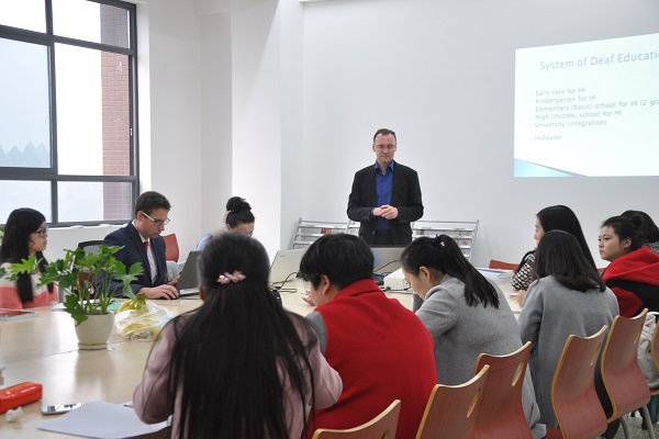 11月14日下午4:30—6:00,捷克帕拉茨基大学的专家Jiri Langer博士与特教学院的师生在特教大楼资料室开展主题为《听障儿童手语教学》的专题研讨。