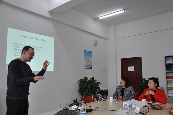 11月15日上午10:30—12:00,捷克帕拉茨基大学的专家Jiri Langer博士与特教学院的师生在特教大楼资料室继续开展主题为“听障儿童手语教学”(Sign Language Teaching of Children with Hearing impairment)的专题研讨。