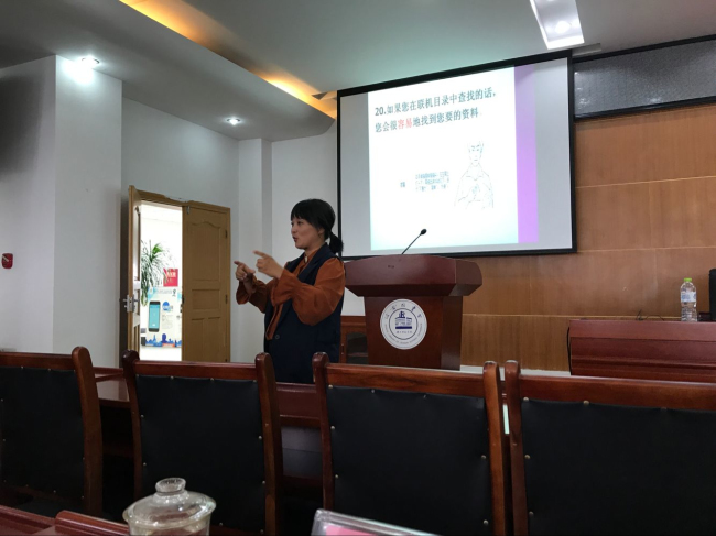 10月13日下午两点半,残疾人教学部为图书馆提供的本学期第三次手语培训在图书馆五楼报告厅进行。此次培训的主讲教师是特教学院的残疾人教学部部长张杨,参与培训的人员为图书馆的全体教职工。