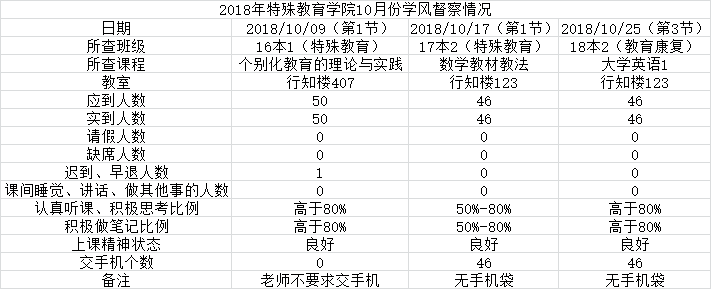 为了进一步加强公司的学风建设,营造良好的学习氛围,展现同学们目前的学习风貌,努力营造良好的育人环境和校园氛围,公司员工分会学科部安排本部门干事于2018年10月份(即第6、7、8周)在行知楼对本院大一、大二、大三班级进行了三次查课。