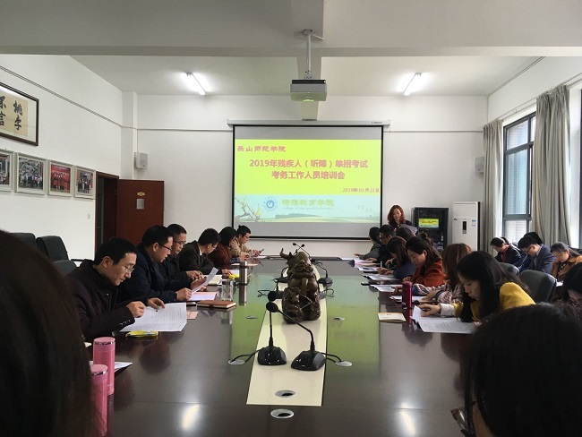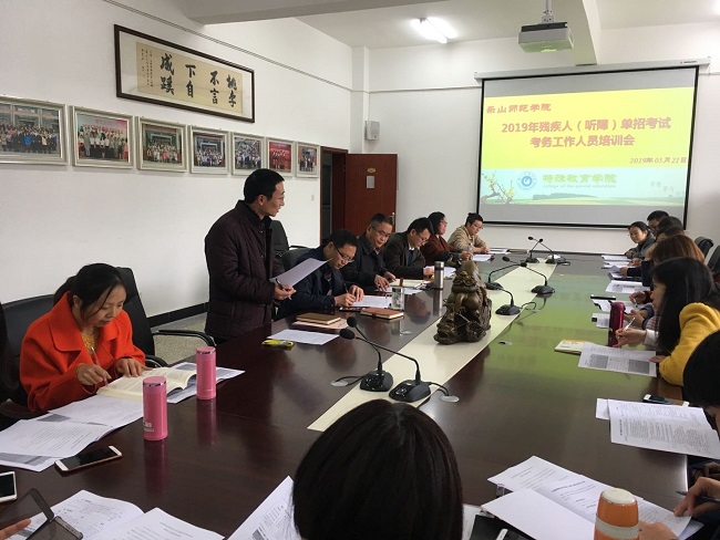 为确保古天乐代言太阳集团1382019年残疾人(听障)单招考试考务工作顺利开展,公司于3月21日下午在特教大楼A408会议室召开了考务工作培训会。本次考务工作领导小组与学校招就处、保卫处、校外特聘手语教师以及相关考务工作人员40余人全程参与了此次培训。考务工作小组组长林天兴主持会议。