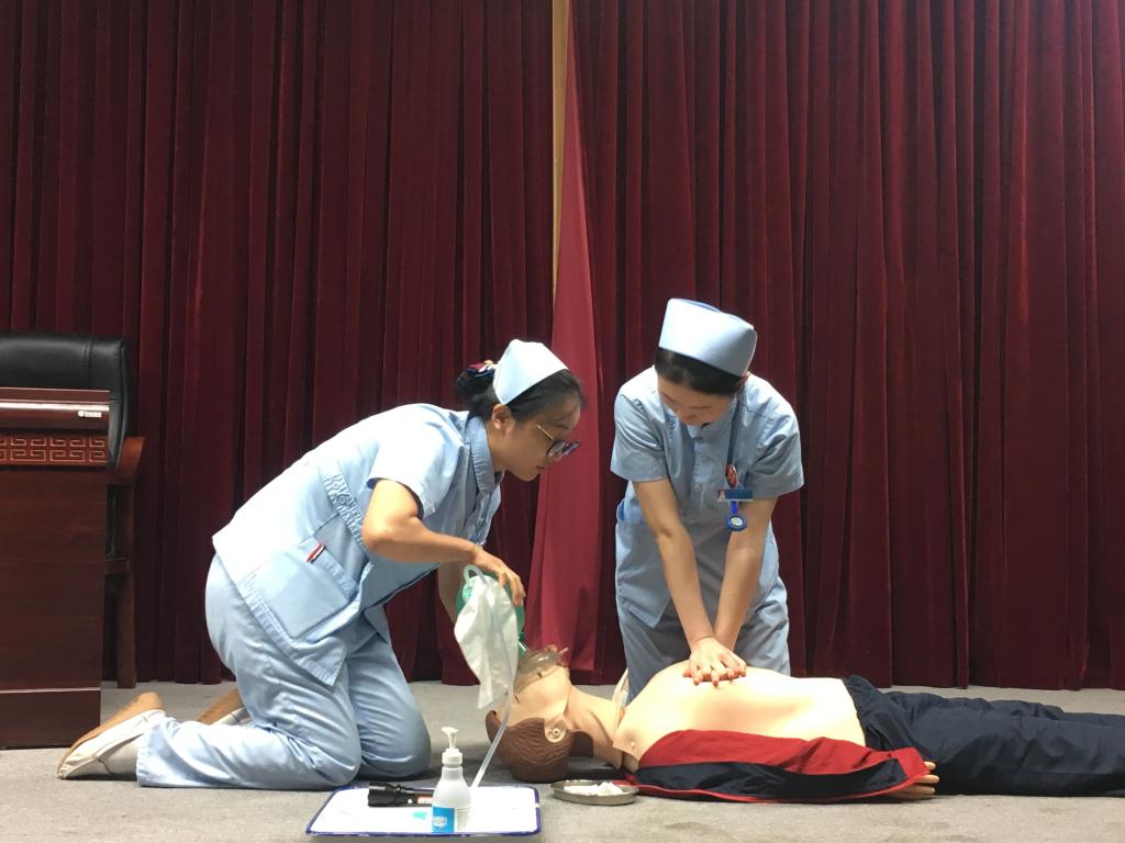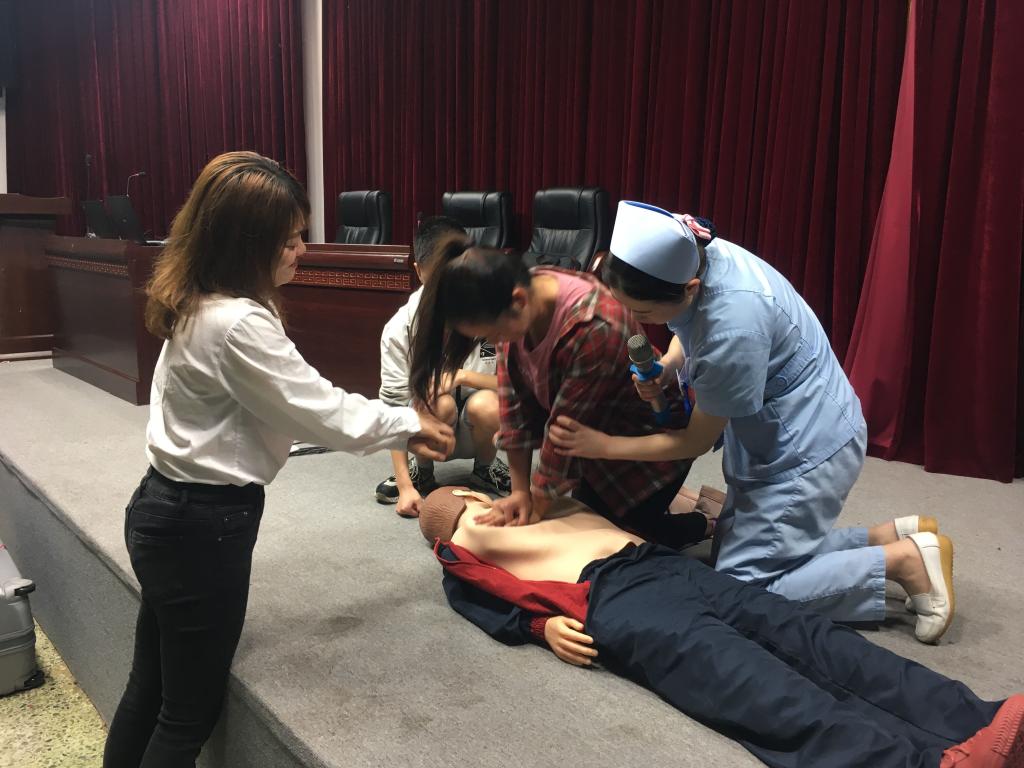 在随后进行的“单人双人徒手心肺复苏术”培训中,妇幼保健院的医生和护士们向同学们演示了心肺复苏术的全过程,详细讲解了判断意识、胸外按压、开放气道、人工呼吸等步骤,并邀请同学们上台实操,得到了良好的反响。活动结束后,还向全体同学发放了宣传手册及计生用品。