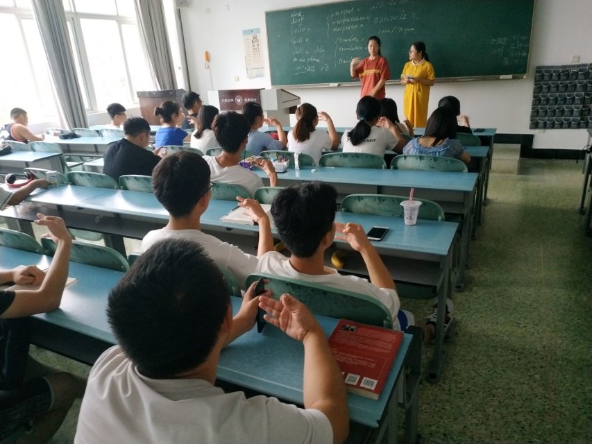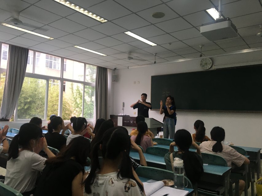 活动以"微课堂"的形式展开,志愿者们利用空闲时间自行联系各个学院开展手语教学。18特教三班听障员工宋智秀和18教康一班胡国琼两位志愿者于6月3日对经管学院市场营销专业同学进行了约三十分钟的手语教学,教学内容包括手语歌——《明天你好》以及一些日常手语等。