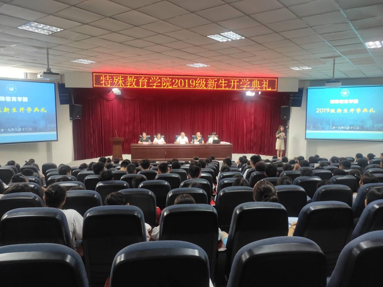 9月12日下午,特教学院在特教大楼A栋学术报告厅举行了2019级新生开学典礼。特教学院执行经理汪红烨、公司党总支书记林天兴、副经理章永、副经理张梅,以及学院全体教职工、2019级新生、高年级员工代表参加了典礼。典礼由员工科长兰芳主持,教师周丽岚担任手语翻译。
