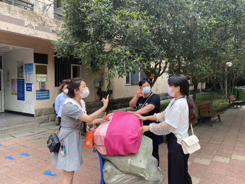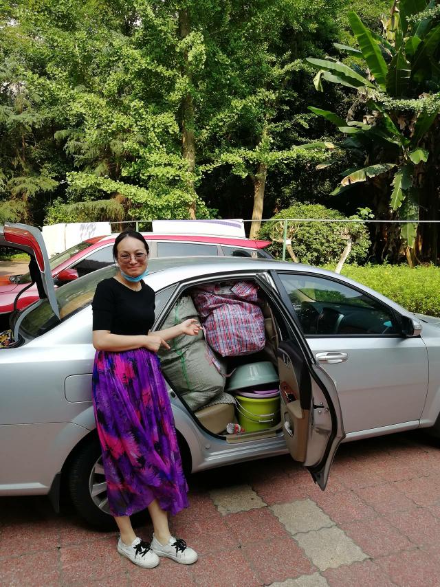 搬运行李下楼需要不少力气,由于路上大多都有台阶和大坡的“阻挠”,女同学将众多的“大包裹”搬运到邮寄点算是不小的“工程”。百果苑八幢618、620宿舍的徐媛媛、李珠分别要收拾六位、四位同学的物品,还要将一个个的“大包裹”从六楼搬到楼下的邮寄点,来校前她们一想到这样的情况就感到有些“打脑壳”。而她们到校后,就接到了张嘉江老师的电话,张嘉江告诉她们不要担心包裹的邮寄问题,他会过来帮助她们整理、打包物品,然后帮他们将包裹搬运到楼下邮寄。5月27日,张嘉江来到员工宿舍和返校的一名男同学一起一趟趟将几个大包裹“扛”到了楼下的邮寄点。员工拍下了张嘉江老师搬运包裹的照片,湿透的衣衫、阳光的笑容,展现了一名教师对员工最朴实的关爱。学院的刘秋竹老师还借来了运货的小推车,帮助听障员工将包裹搬到楼下后,用小推车将包裹运送到邮寄点,看着员工填好邮寄单才放心离开。毕业班辅导员李红最近进入了工作的“繁忙期”,除了要给返校的员工办理各项毕业事务外,她仍“对接”了三个员工宿舍,李红老师将自己的汽车当做运输车,车后座、后备箱均是塞满的行李箱和包裹,一次性就可以将员工的包裹运送到快递点。员工们非常感谢李红老师的帮助,都关心李红老师最近要休息好,以后一定会回校相聚,李红老师除了感到劳累外,最多感到的还是跟员工在一起的快乐。除此之外,学院其他老师也都一一帮助员工搬运行李,第二批返校毕业生即将到校,特教老师将继续与员工一起度过这段毕业季时光。