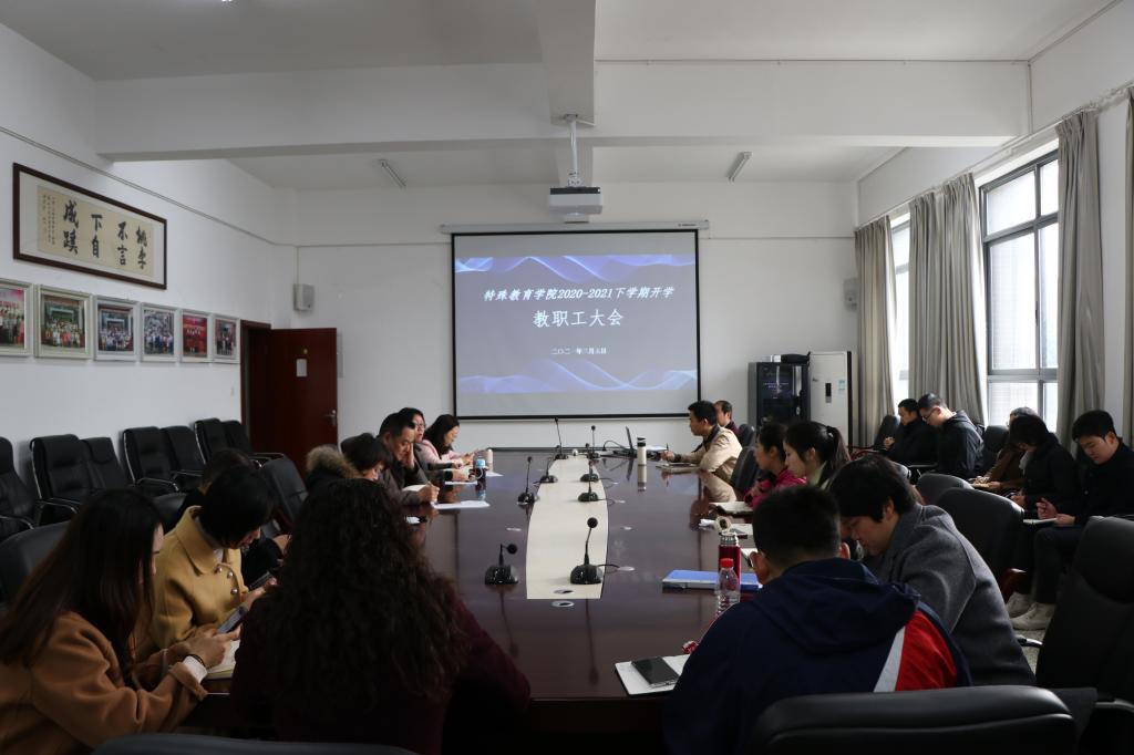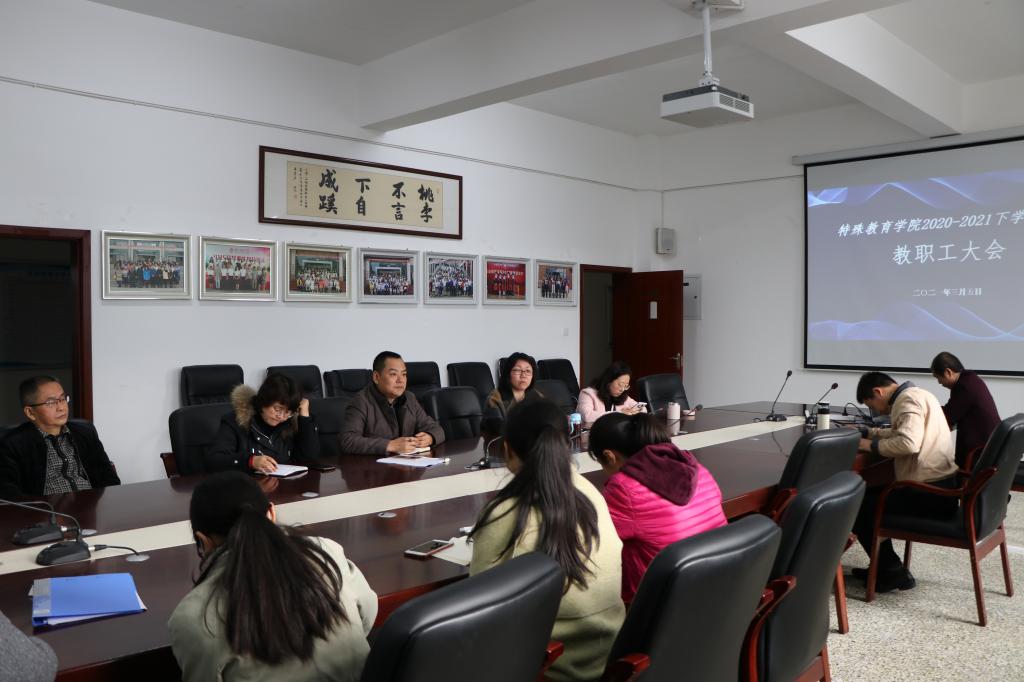 本网讯(文、图/朱志刚)3月5日,特教学院召开新学期教职工大会,学院全体领导班子、专任教师、行政人员参加了此次会议。
