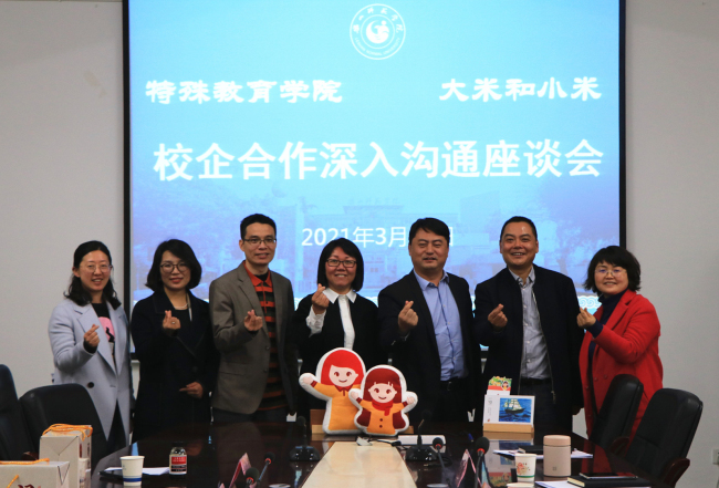 潘采夫感谢学校的盛情接待。他介绍,“大米和小米”是中国专业的孤独症儿童康复服务平台,主要提供干预康复、融合支持、家长培训及科普咨询等一体化服务,目前已在北京、上海、广州、深圳、郑州、武汉、南京、东莞、宁波、杭州、佛山、苏州、长沙等10余座城市开设了20余家线下干预康复中心,“大米和小米”成都中心也将于今年6月开业。他指出,“大米和小米”以“孤独症儿童康复服务”为中心的业务与学校特殊教育应用型人才培养具有高度的相关性和契合度,与学校携手实施校企产教融合深度合作,一定是多方共赢的重要举措。他相信,在双方的共同努力下,一定会结出校企合作的硕果。