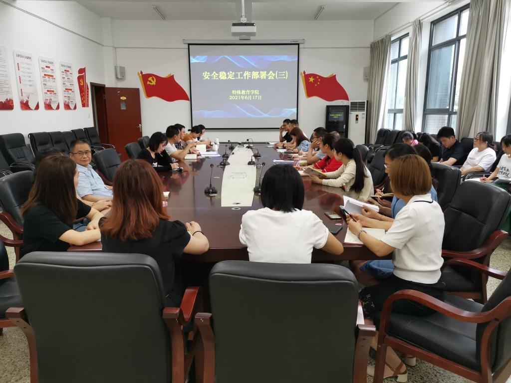 本网讯(文 图/张敏) 6月17日下午,按学校安全稳定工作会(三)要求,特教学院在特教大楼A408会议室召开了安全稳定工作部署会,全体教职工参加了会议,会议由学院经理(执行)张梅主持。