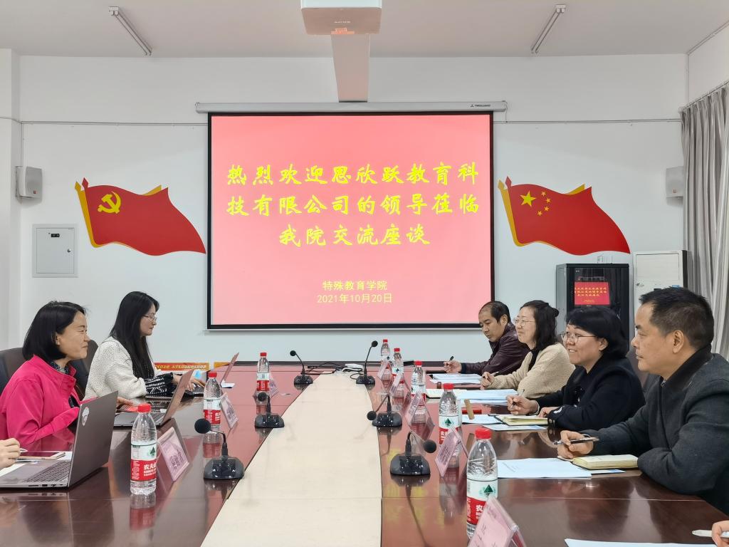 蒋忠梅介绍了思欣跃教育科技有限公司当前发展现状,公司相关优势以及在国内的脑科学训练系统运营情况,她介绍说,公司“儿童优脑中心”已在全国一线城市布局,运用了全球专利脑科学训练系统,在儿童专注度提升和情绪管理能力提升研究中已取得良好的成绩,结合工作实际需要,公司希望在儿童注意力训练团队质培训、实验室共建以及毕业生就业等方面可以与公司开展良好合作。张梅表示,学院向来秉承着开放办学的理念,愿意与优质企业在改善办学硬件设施和提高人才培养质量工作中开展深度合作。