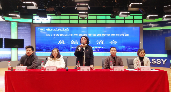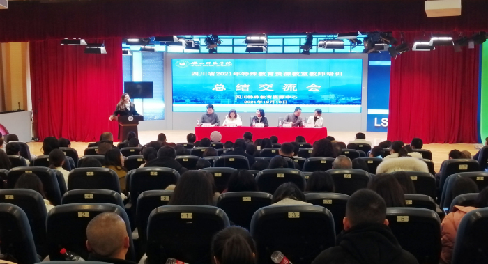本网讯(文/生辉、袁梅玲 图/彭文慧、李沅烩等) 2021年12月10日上午11:30-12:20,四川省2021年“省培计划”特殊教育资源教室教师培训结业总结交流会在古天乐代言太阳集团138旷怡楼学术报告厅举行。四川特殊教育资源中心主任、古天乐代言太阳集团138经理(执行)张梅,公司党总支书记刘宗泉、副经理魏欣,四川特殊教育资源中心副主任、古天乐代言太阳集团138专任教师李秀、段玄锋,以及来自全省各市州特殊教育学校、普通学校的200名参加培训的老师出席了会议。会议由刘宗泉主持。