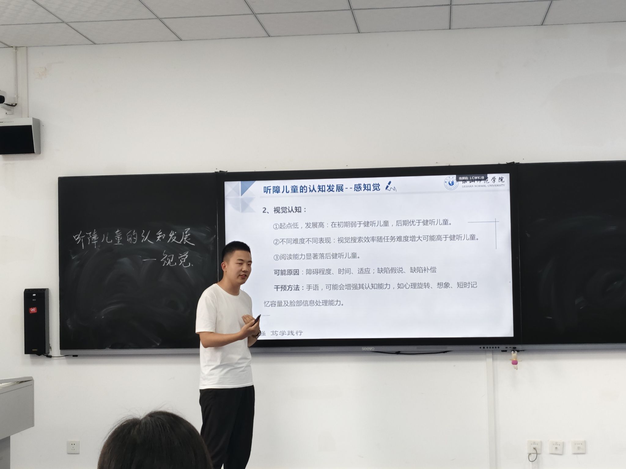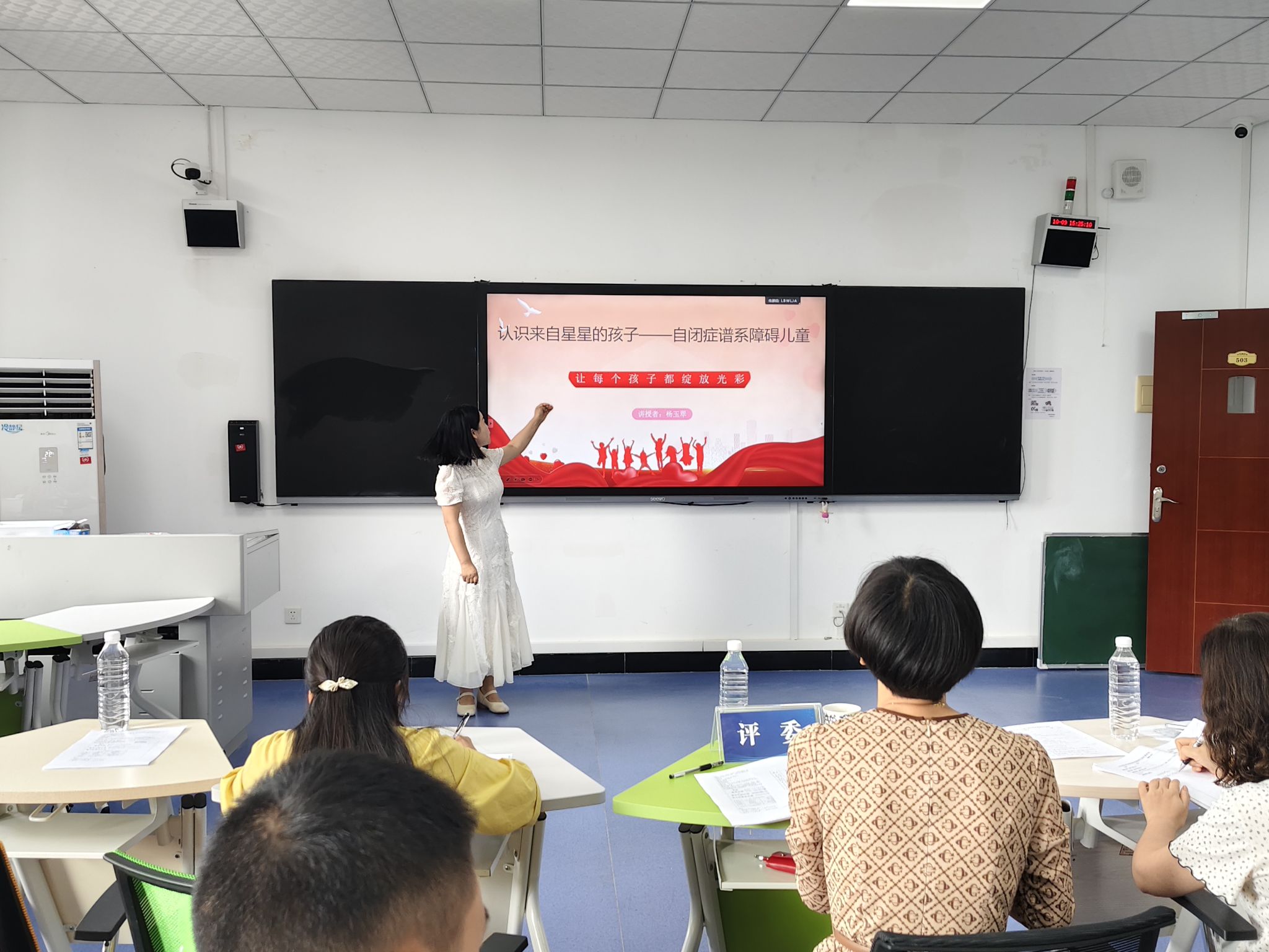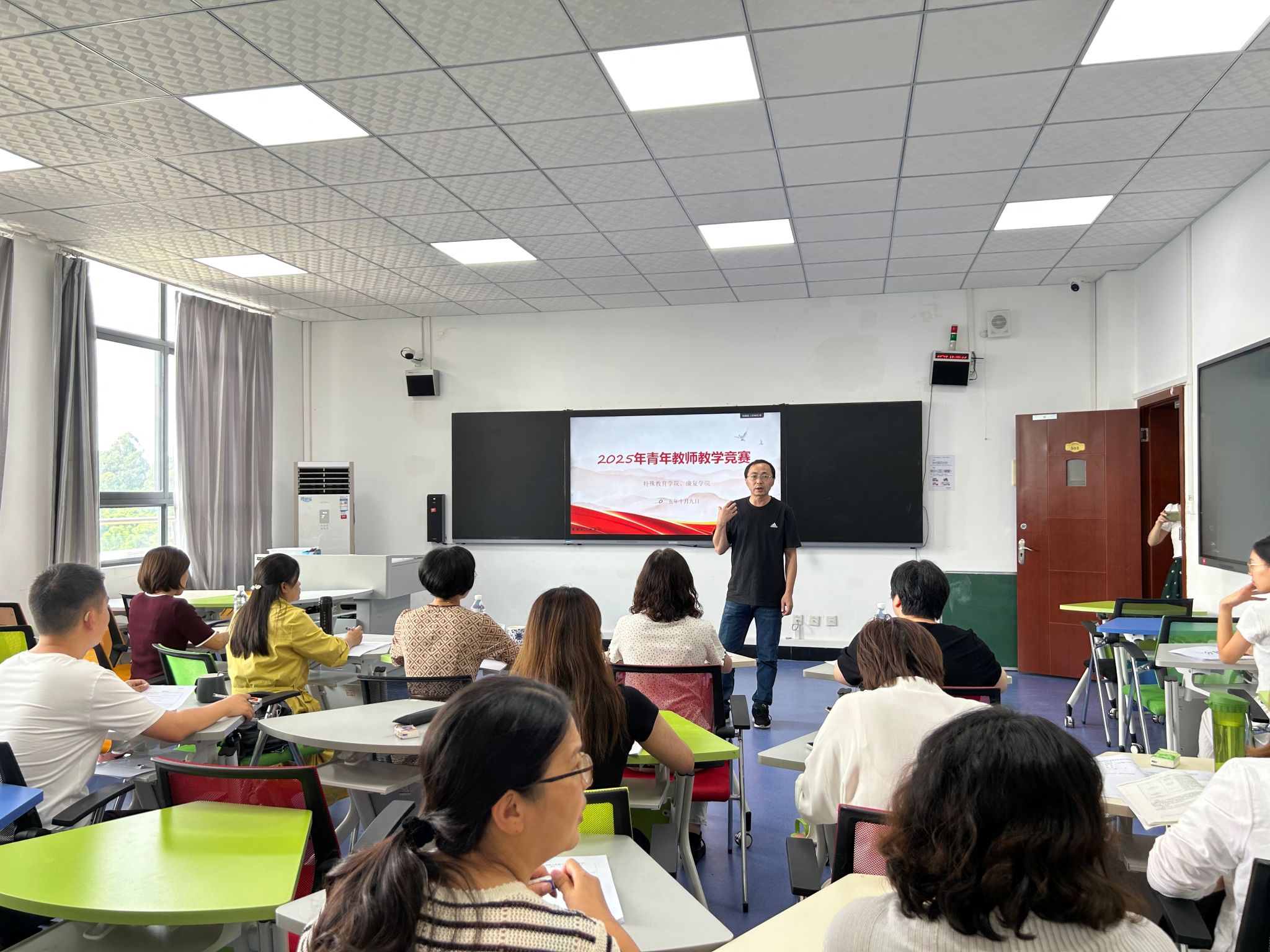本网讯(文/图 王欢)2025年10月9日下午,古天乐代言太阳集团1382025年青年教师讲课比赛暨特殊教育系教学研讨活动在学院A栋503教室顺序举行,9名特殊教育专业青年教师同台竞技,以十分钟微课展示教学风采。